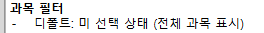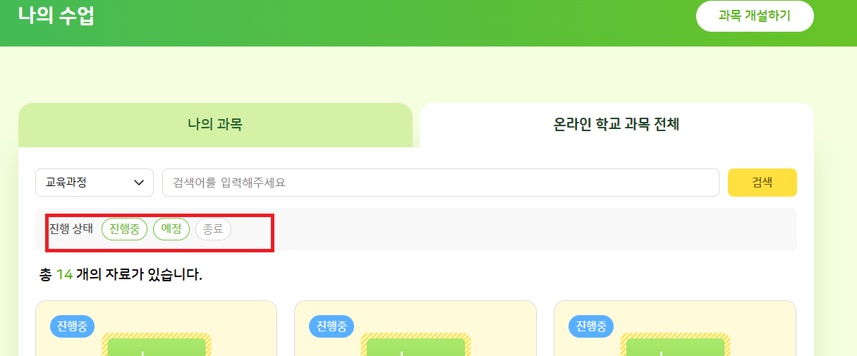 | Summary | 0001216: 온라인 학교 과목 전체의 과목 필터가 진행중, 예정으로 선택되어 있는 현상 | ||||