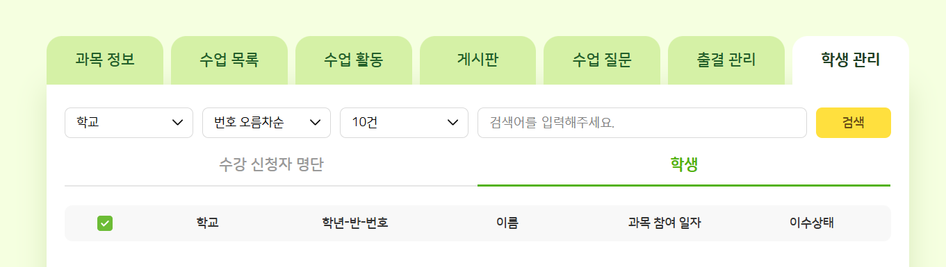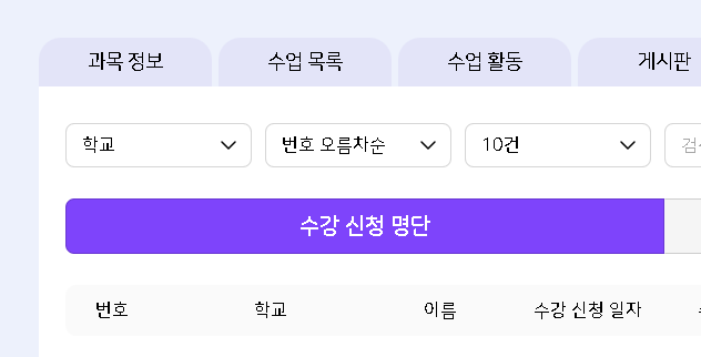 | Description | 학생 관리 > 수강 신청자 명단 탭명이 기획과 상이 기획 : 수강 신청 명단 TB : 수강 신청자 명단 | ||||