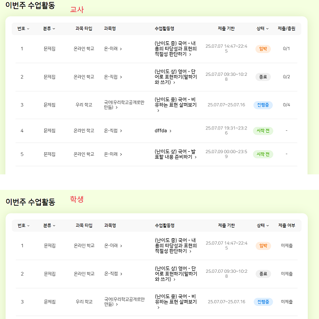 | 2025-07-08 03:30 | 이세희 | Summary | 학생 > 이번주 수업활동에 시작 전 문제집 미노출되는 현상 => 학생 > 이번주 수업활동에 '시작 전' 문제집 미노출되는 현상 |