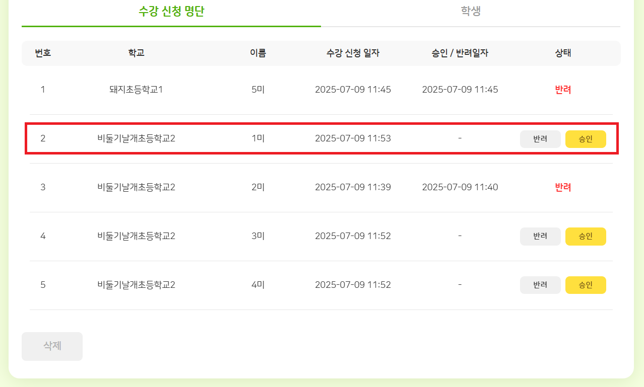 | Description | 수강 신청 명단의 순서에 관한 기획 문의 직접 승인 과목일 경우, 현재 TB에서는 번호 정렬이 수강 신청 일자가 아닌 학교 이름 오름차순(ㄱ,ㄴ,ㄷ 순)으로 정렬되는 것 같은데 이것이 맞는지 기획 문의 드립니다 ex) 비둘기날개초등학교2 1미 학생이 가장 나중에 신청했는데 11:53 번호에는 2번으로 되어있음 | ||||