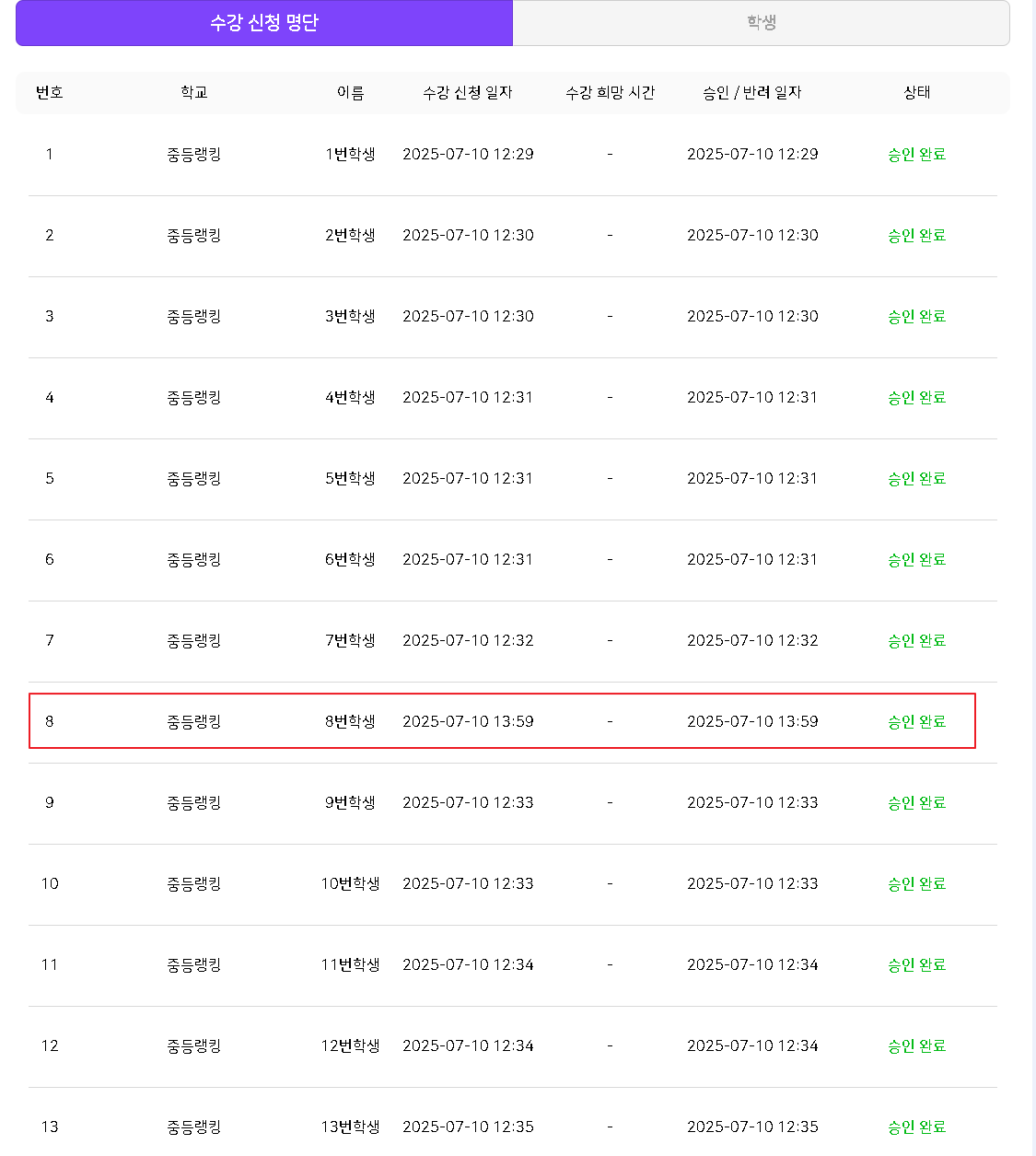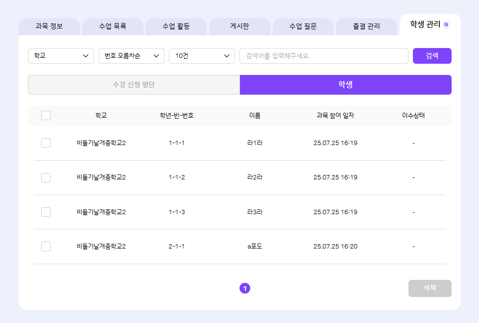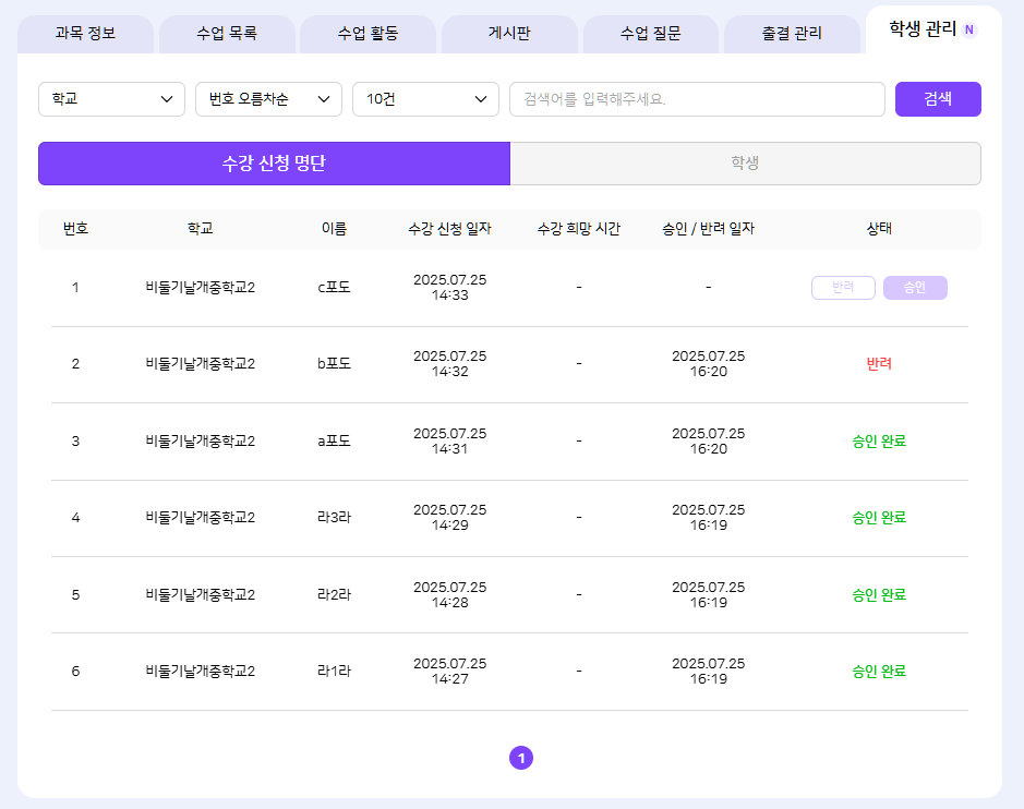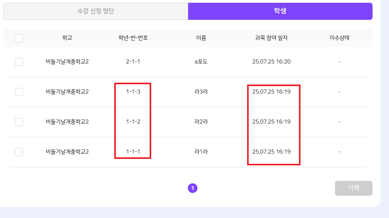 1. 수강신청명단 탭 > 수강신청일자 : 수강신청일시 최신순 정렬(명칭과 노출은 변경 X) 2. 학생 탭 > 과목참여일자 : 학교명 > 학년 > 반 > 번호 순 오름차순 |