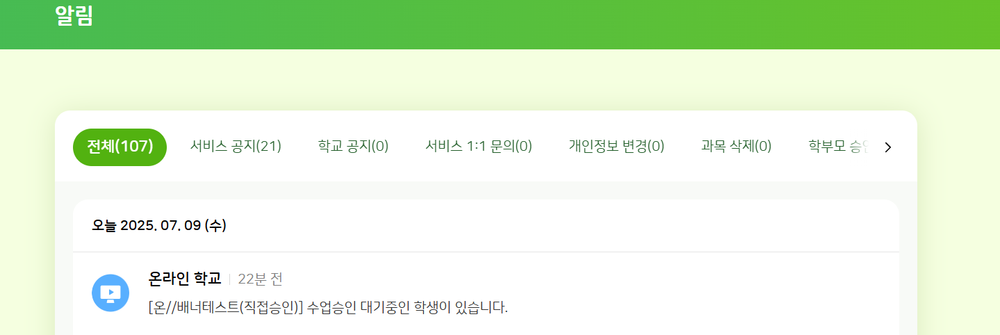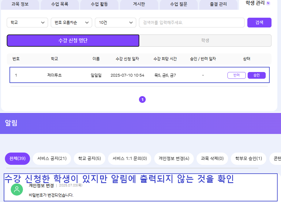 | 2025-07-10 01:52 | 이세희 | Summary | 직접 승인 과목에 학생이 수강 신청했을 때 교사에게 알림 노출되는 현상 => 직접승인 과목에 학생이 수강 신청했을 때 교사에게 알림 노출되는 현상 |