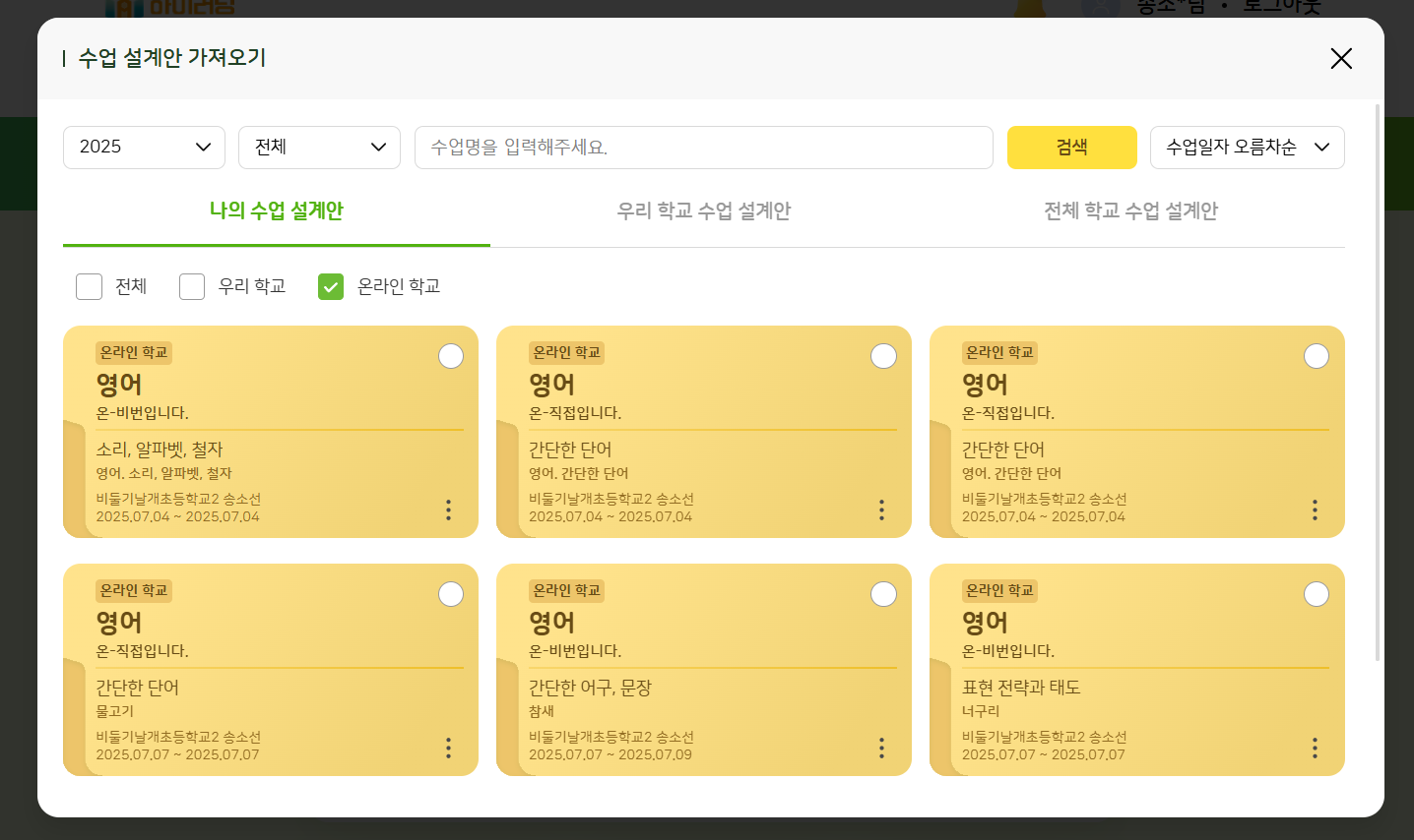 | Steps To Reproduce | 1. 교사 로그인 2. 수업 설계 > 수업 설계안 가져오기 > 우리학교 또는 온라인학교 선택 3. [X] 창닫기 4. 다시 수업 설계안 가져오기 클릭 시 체크박스 확인 | ||||