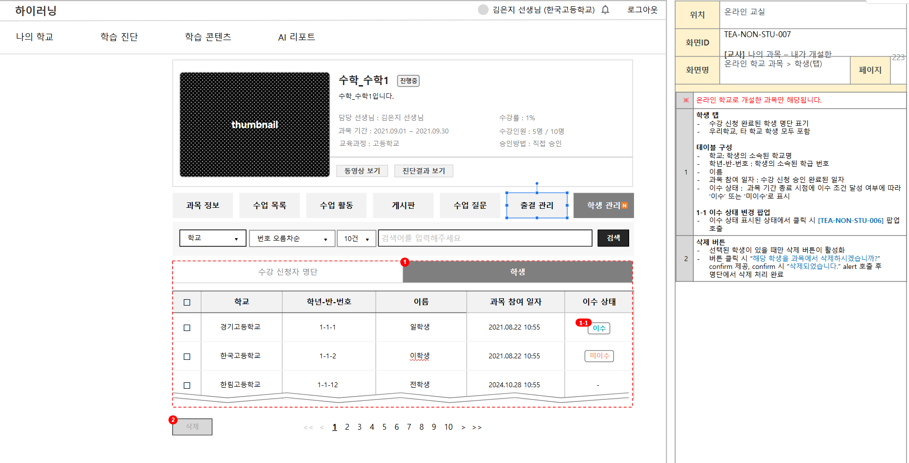 온라인 학교 과목 > 학생관리 > 학생 탭의 정렬 기준 기획이 작성되어있지 않습니다. 수강 신청 명단과 마찬가지로 수강 신청일 기준 정렬로 하면 될까요? 추가적으로 수강 신청일이 동일 한 경우 그 다음 정렬 순서는 어떻게 되는지 기획 검토 부탁드립니다. (2025-07-09)_KT LanEdu_화면설계서_02.myclass_v.3.2.16.pptx p223 |
