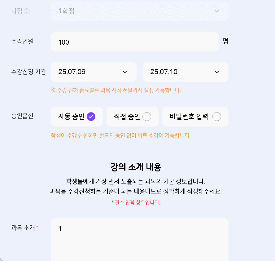 | Description | 온라인 학교 과목 수정시 수강 신청 기간 클릭 후 [취소] 버튼 누르면 날자 삭제되는 현상 발생 | ||||