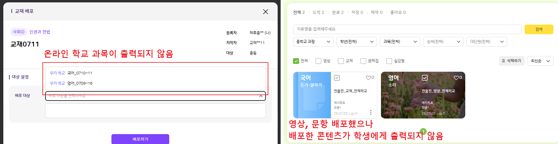 | Description | 온라인학교 과목에 콘텐츠가 배포되지 않는 현상입니다. - 영상 : 과목 선택 후 배포 진행했으나, 배포 수정하기 팝업에 과목이 출력되지 않고 학생에게도 영상 배포되지 않음 - 문제집 : 배포 수정하기 팝업에 배포한 온라인 과목이 출력되나, 학생에게 문제집이 출력되지 않음 - 교재 : 배포하기 팝업에 온라인 수업이 노출되지 않아 배포 불가능 | ||||