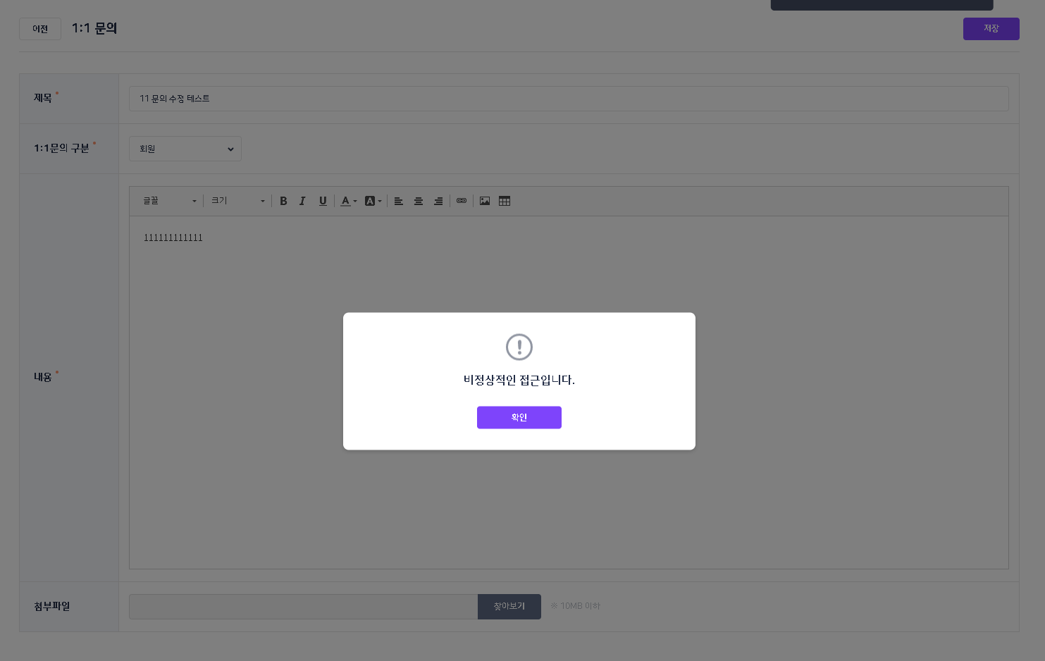 테스트 계정 : watest11 1번 문의 글 : 729 2번 문의 글 : 728 728번 접근 -> 수정시에 729번으로 변경 -> 729가 수정됨을 확인. 이슈 재현되어 reopen 하겠습니다. |