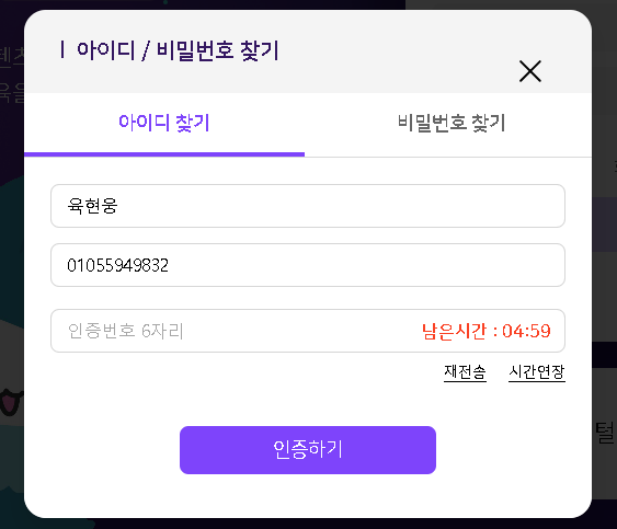 | Steps To Reproduce | 1. 아이디/비밀번호 찾기 > 아이디 찾기 2. 인증번호 재전송 클릭 | ||||