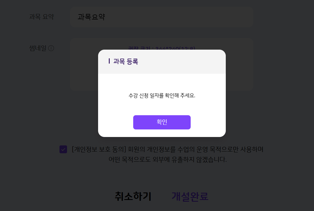 | Description | 수강 신청 기간을 과목 시작 4일 전으로 했을 때 alert 노출되는 현상 *기대결과 : 과목 개설이 정상으로 되어야 함 | ||||