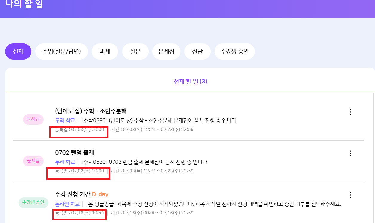 | Description | 교사 > 나의 할 일이 최신순으로 정렬되지 않는 현상 *기대결과 : 최신순으로 정렬되어야 함 | ||||