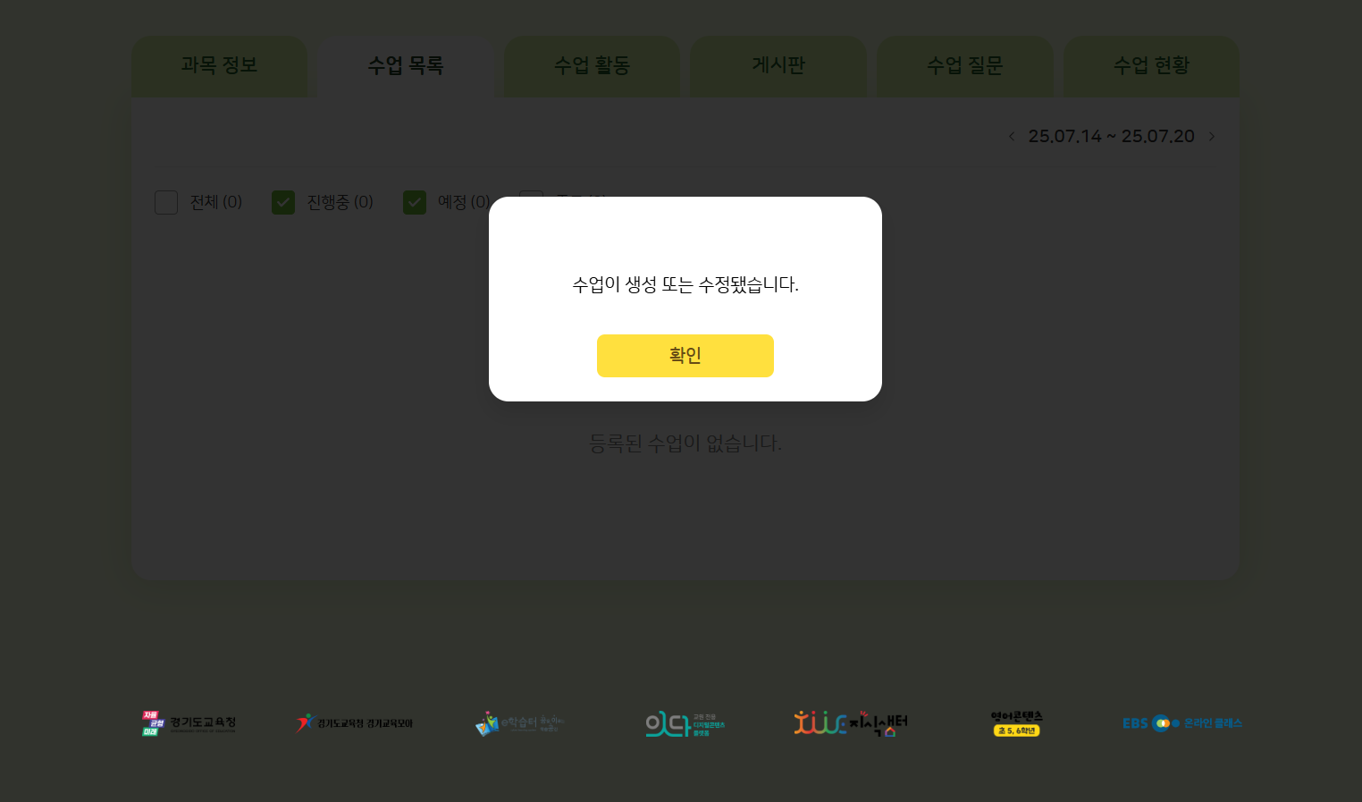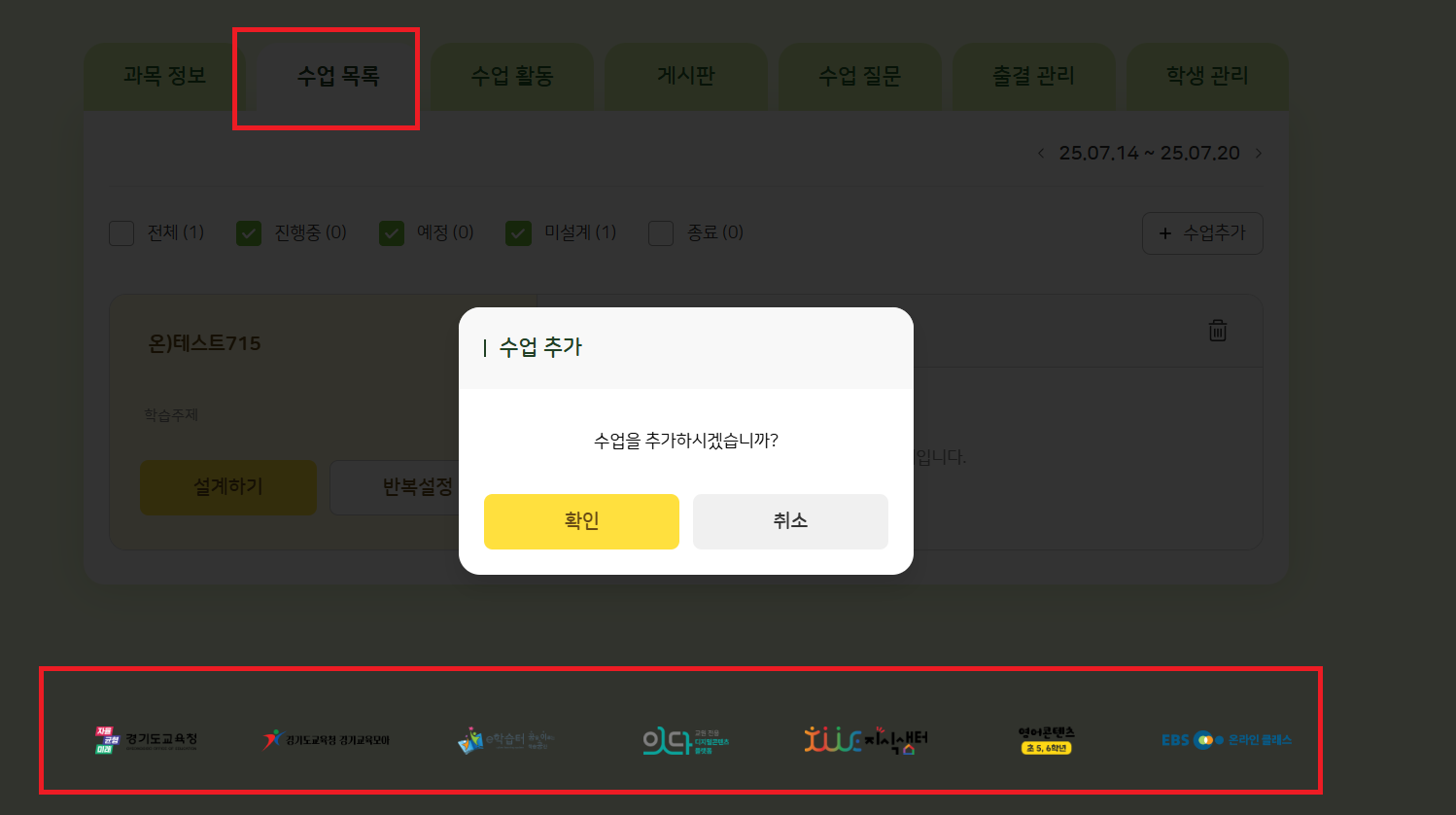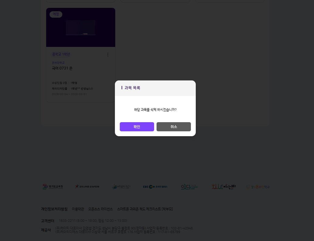 | Description | 나의 수업 > 수업 목록의 각종 버튼 클릭 시, footer 제공사 배너가 튀는 현상 *기대 결과 : footer 제공사 배너가 튀지 말아야 함 자세히 말씀드리자면, 온라인 과목이던/기존 과목이던 모두 나의 수업 > 수업 목록의 각종 버튼(설계하기, 반복설정, 수업추가, 삭제 등)을 클릭하면 하단 footer 제공사 배너(경기도 교육청, 잇다, 지식샘터 등)가 튀는 현상이 발생하여 이슈 등록하였습니다 | ||||