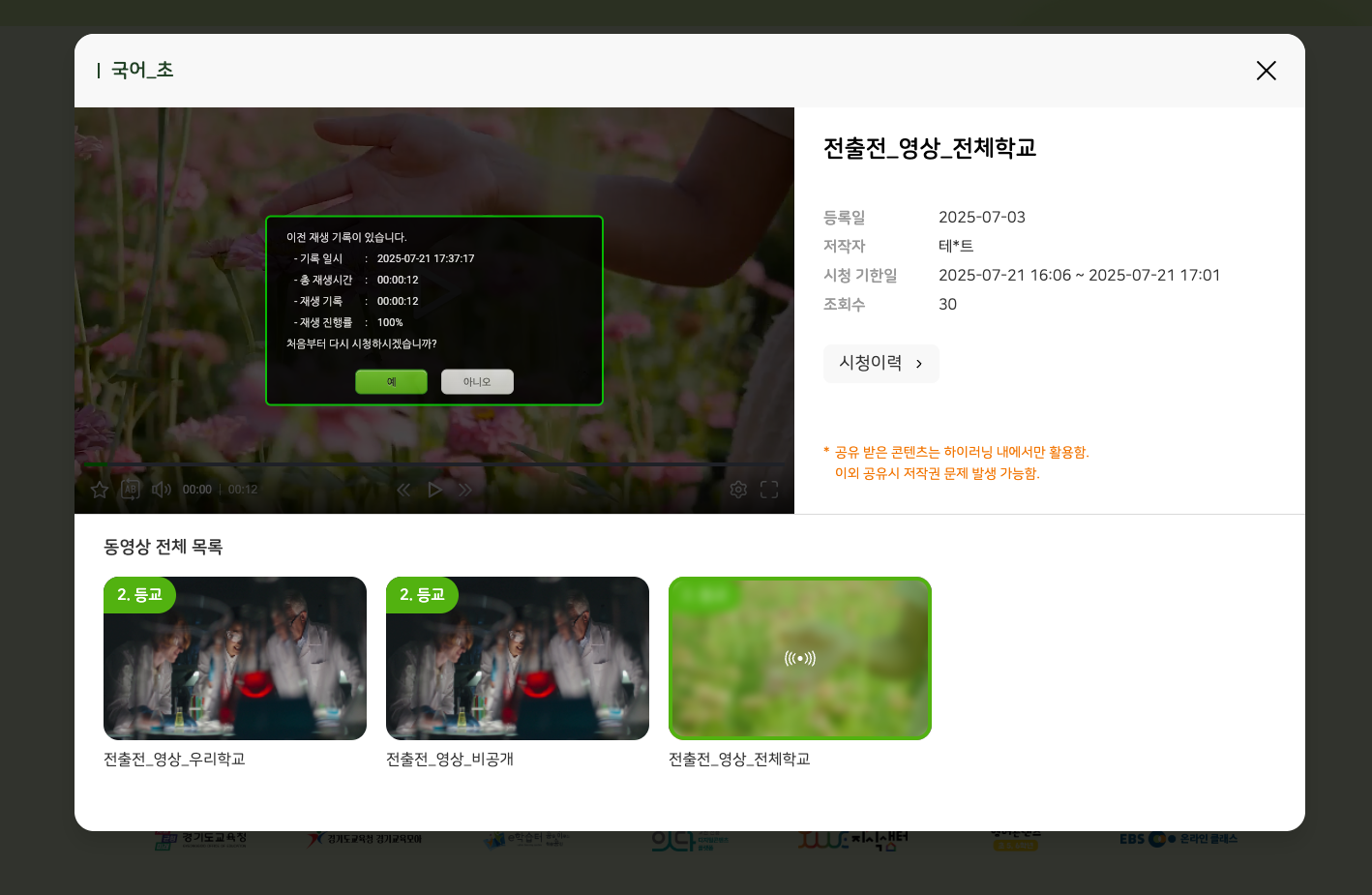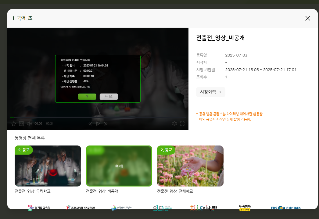 1. 헤더 > 동영상 보기 2. 수업카드 > 동영상 보기 동일 계정 현상 재현 되지 않습니다. 혹시 online 도메인이 맞는지 확인 부탁드립니다. |