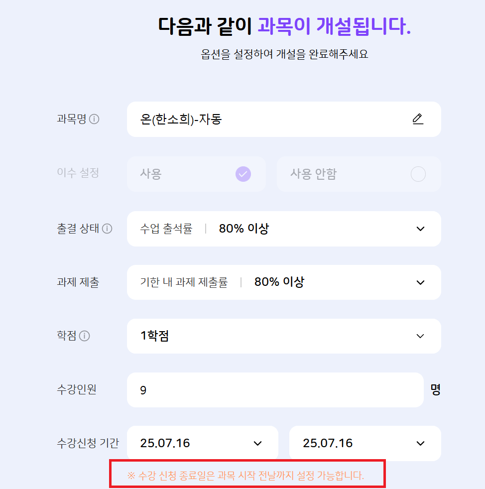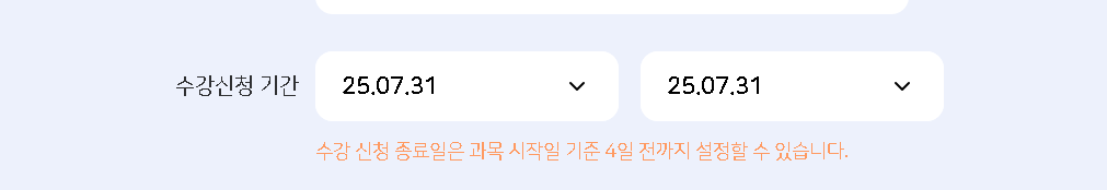 안녕하세요! 해당 영역에 대한 안내가 필요하여 삭제하지 않고 아래와 같이 문구 수정하였습니다. → ※ 수강 신청 종료일은 과목 시작일 기준 4일 전부터 설정할 수 있습니다. |