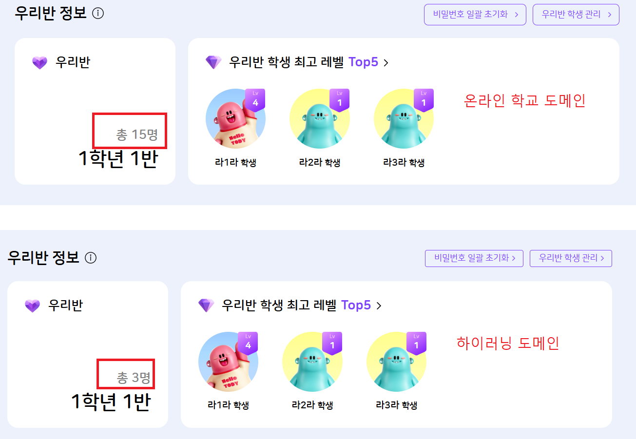 | Steps To Reproduce | 1. 교사 로그인(온라인 학교 도메인) 2. 나의 학교 > 나의 교실 > 우리반 정보 > 총인원 확인 | ||||