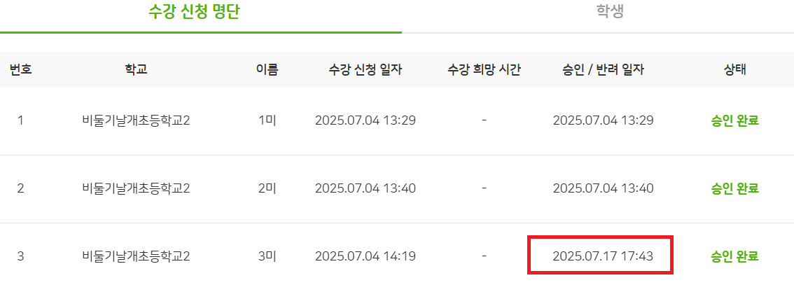 | Additional Information | TB sss1004 과목명 : 온-직접 3미 학생은 수강 신청 기한 내에 올바르게 신청했으나 교사가 승인/반려 아무것도 안한 상태였고 과목이 종료된 후에 교사가 승인한 상황 | ||||