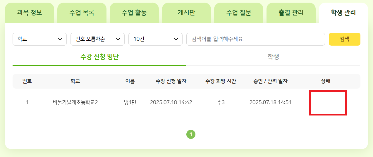 | Steps To Reproduce | 1. 너구리초등학교1 lem1004 교사가 과목명 : 온)이은미-직접(승인) 생성 2. 너구리초등학교1 6-1-1 냉1면 학생이 해당 과목 수강 신청하고 lem1004가 승인함 3. 너구리초등학교1 6-1-1 학생을 비둘기날개초등학교2 1-1-4로 전학 4. lem1004 로그인 했을 시 학생 관리 > 수강 신청 명단 : 상태에 '승인'이 없는대로 노출 학생 관리 > 학생 : 학생 미노출 | ||||