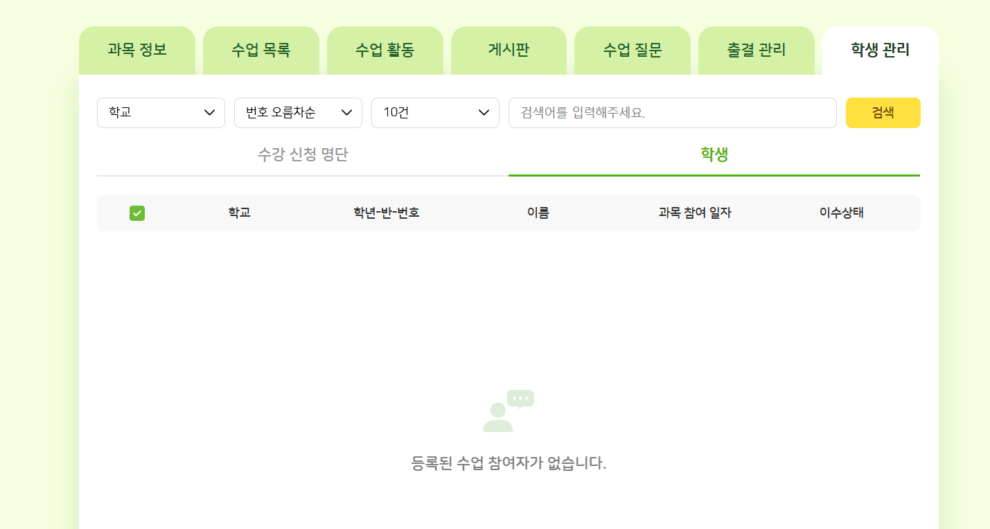 코멘트 주신대로 개발 부탁드립니다 학생 관리 > 수강 신청 명단 탭 / 학생 탭 → 미 노출 |
