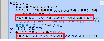안녕하세요 7A '과목 시작일 이전 까지로 설정 가능' 이 아니라 '과목 시작일 기준 최대 4일 전까지 설정 가능' 으로 문구를 변경해야하지 않을까요? |