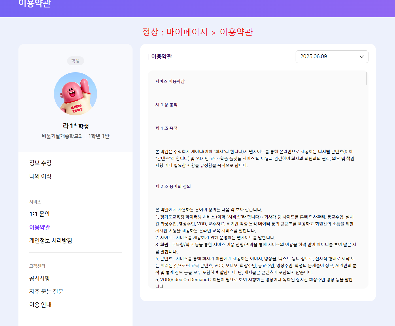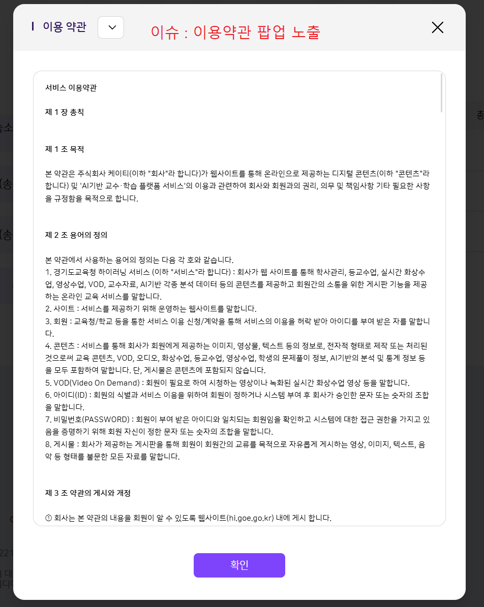 | Description | 하이러닝 이용약관 팝업 노출되는 현상 *기대결과 : 팝업 노출이 아닌 마이페이지 > 이용약관으로 이동해야 함 | ||||