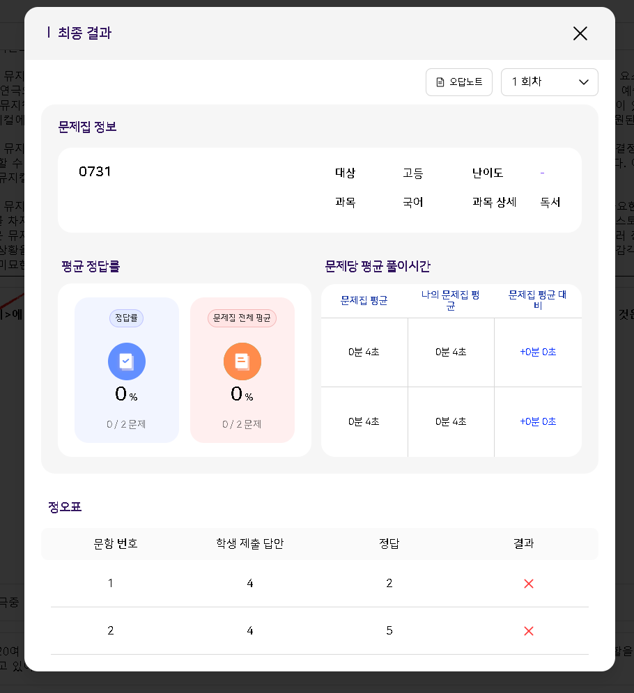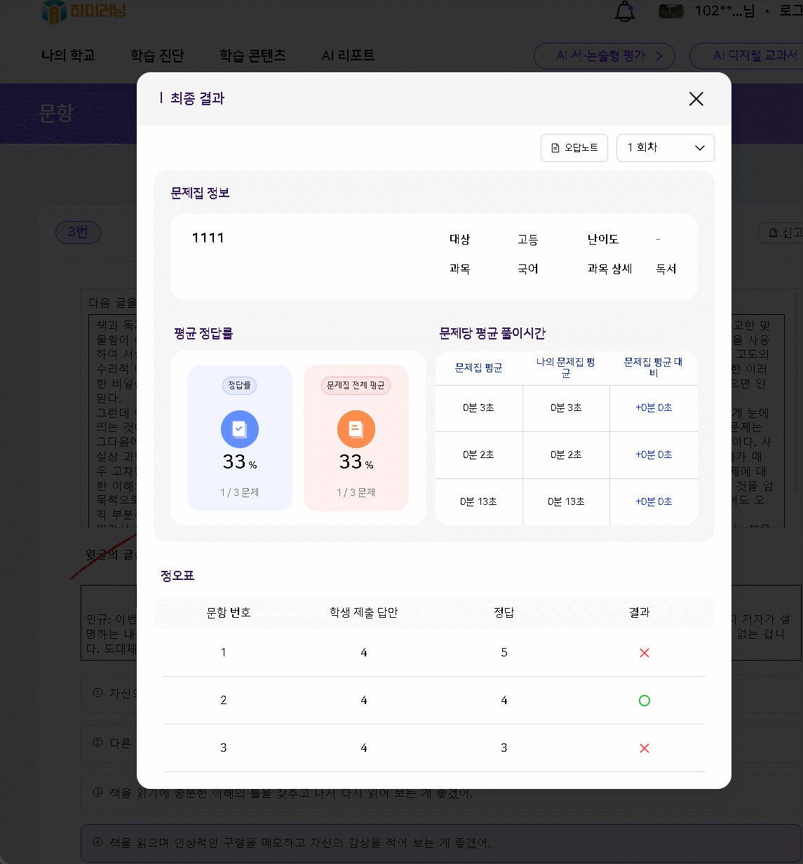| Steps To Reproduce | 1. 학생 로그인 > 내 추천 콘텐츠 > 배포 받은 문항 > 문제 풀이 후 결과창 응시 2. 학생 로그인 > 학습 콘텐츠 > 문항 > 출제(랜덤,AI 추천) > 문제 풀이 > 최종 결과 창 응시 | ||||