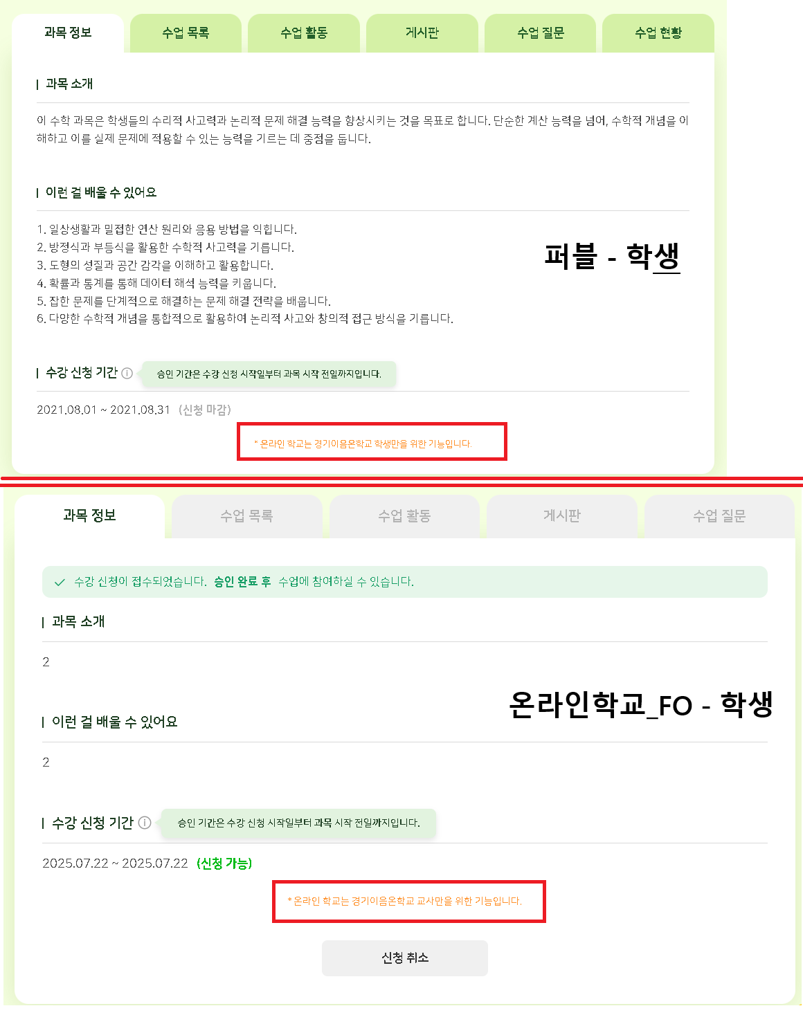 | Steps To Reproduce | 1. 학생 로그인 > 나의 학교 > 나의 수업 > 온라인학교 상세 | ||||