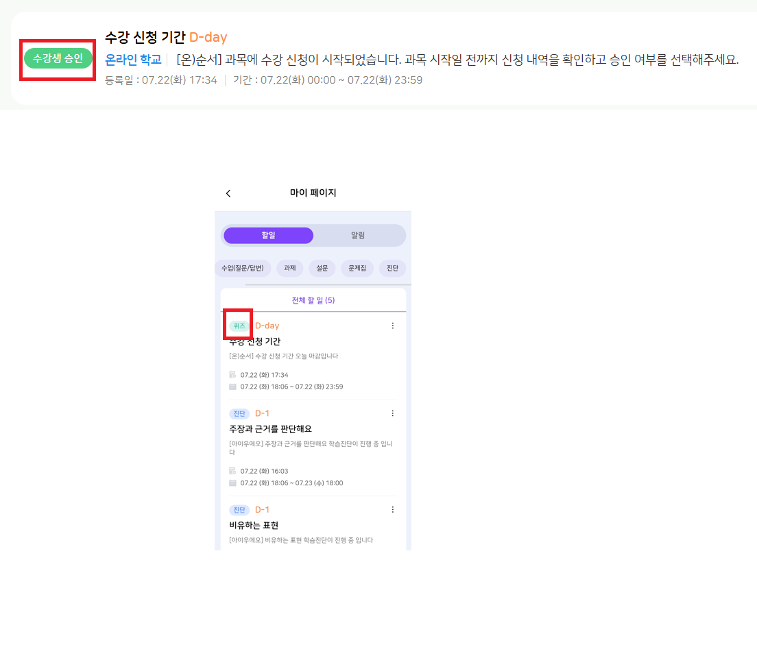 | Description | 모바일 나의 할 일에서 '수강생 승인' 태그가 '퀴즈' 태그로 잘못 노출되고 있는 현상 | ||||