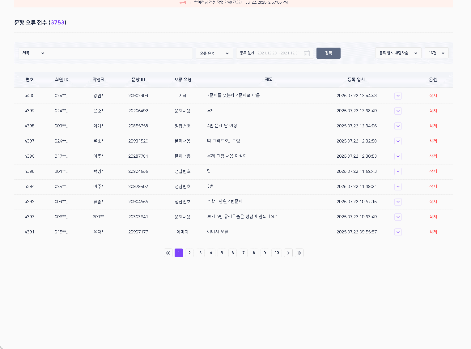 | Summary | 0001338: 플랫폼 BO - 문항 오류 접수 페이지네이션 끝으로가기 클릭시 오작동 | ||||