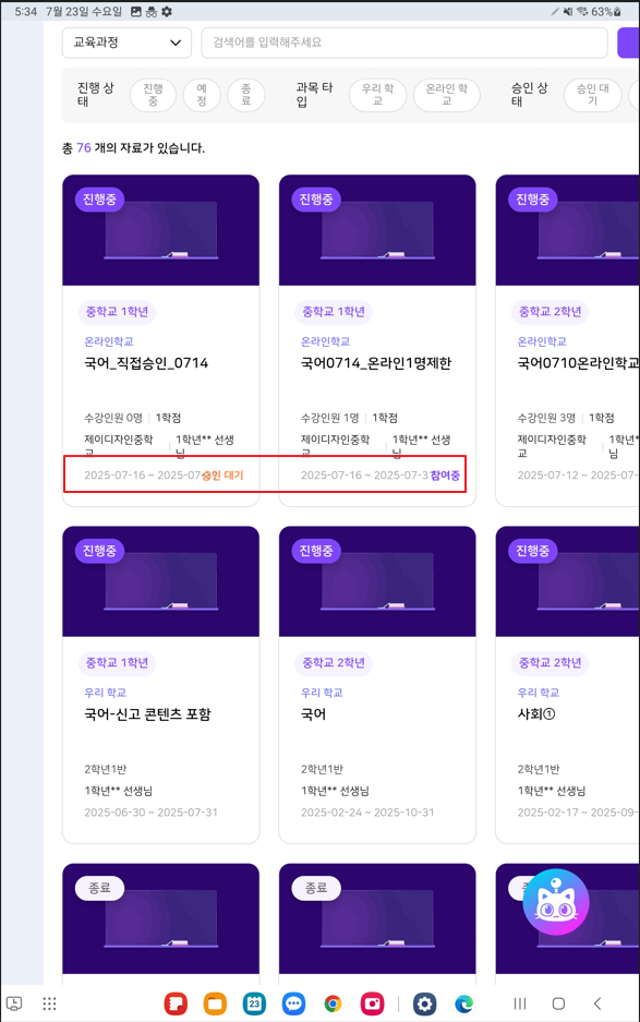 | Description | [태블릿][세로모드][학생] 나의 수업 > 과목 카드에서 기간과 상태 태그 겹침(승인 대기, 참여중) | ||||