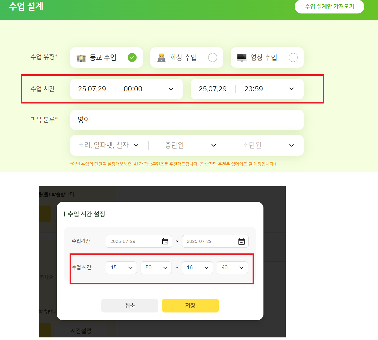| Steps To Reproduce | 1. 교사 : sss1004 과목명 : 영어(6-1) 수업명 : 등교수업, 화상수업, 영상수업 위 수업들을 과목명 : 온(송소선)-자동승인-729오픈 에 복사 2. 온(송소선)-자동승인-729오픈 에서(예정 과목임) 복사해 온 수업을 [설계하기] 버튼 클릭했을 때와 [시간설정] 버튼 클릭했을 때 수업 시간의 defualt 값 비교 [설계하기] : 25.07.29 00:00 ~ 25.07.29 23:59 [시간설정] : 25.07.29 현재시간+5분 ~ 25.07.29 현재시간+55분 *[시간설정]의 시간이 일반적으로는 맞지만 온라인 수업의 경우, 과목 시작일에 맞춰서 수업을 시작할 수 있기 때문에 기획 정의가 필요할 것 같습니다 | ||||
