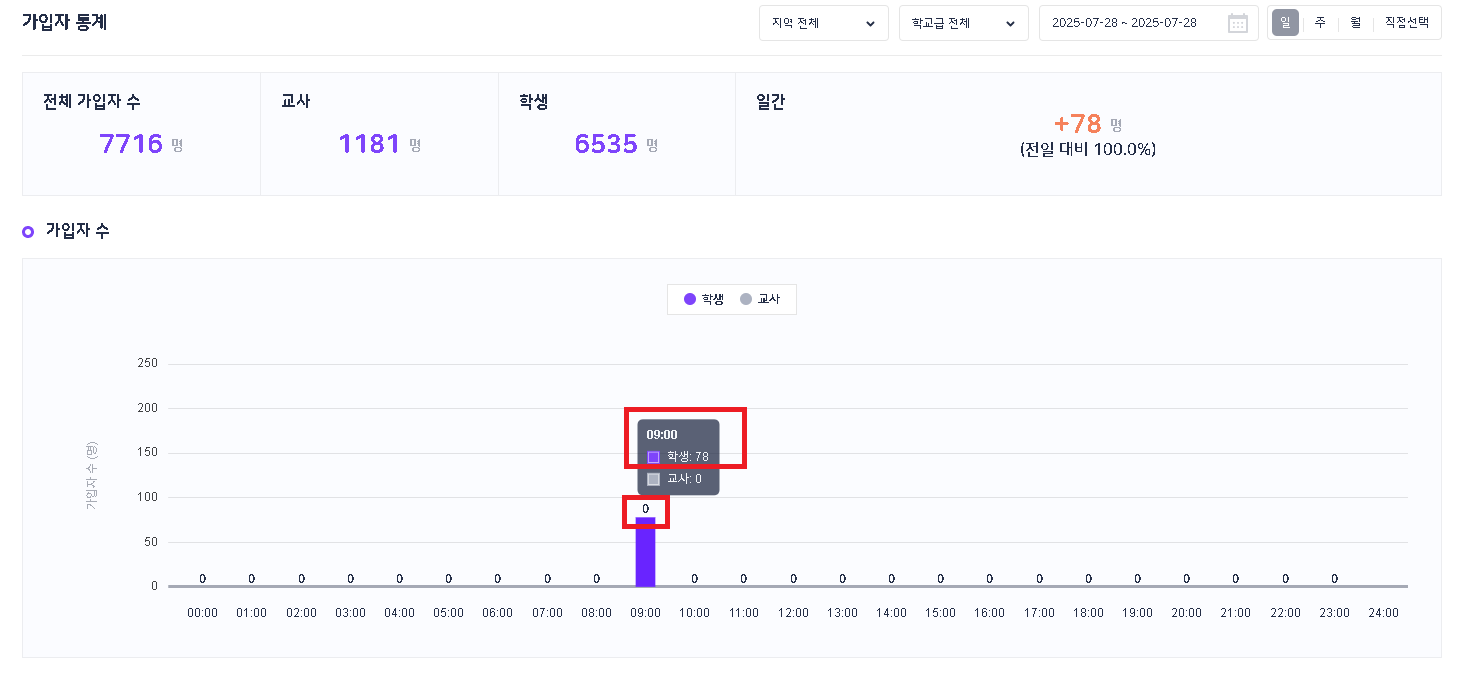 | Description | 가입자 통계 - 막대그래프 영역에 0명이 아닌데 0명으로 표기되는 현상 툴팁에는 학생 78명이라고 나오는데 그래프 상단에는 0명으로 노출되는 현상입니다. | ||||