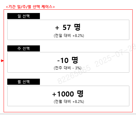 | 2025-07-28 09:00 | 이세희 | Summary | (★기획 문의)플랫폼 BO 가입자 통계 - 가입자 수 증감 요약에 전주, 전월 대비에 대한 상태별 표시 정의 기획 문의 => 플랫폼 BO 가입자 통계 - 가입자 수 증감 요약에 전일만 노출되는 현상 |