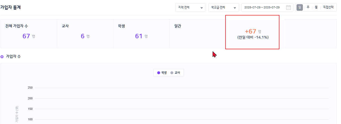 | Description | 플랫폼 BO 가입자 통계 - 가입자 수 증감 요약에 전일만 노출되는 현상 *기대결과 : 전일, 전주, 전월 모두 노출되어야함 기획서 : (2025-07-14)_KT LanEdu_플랫폼관리자_화면설계서_v.3.2.3 p110 2번 디스크립션 | ||||