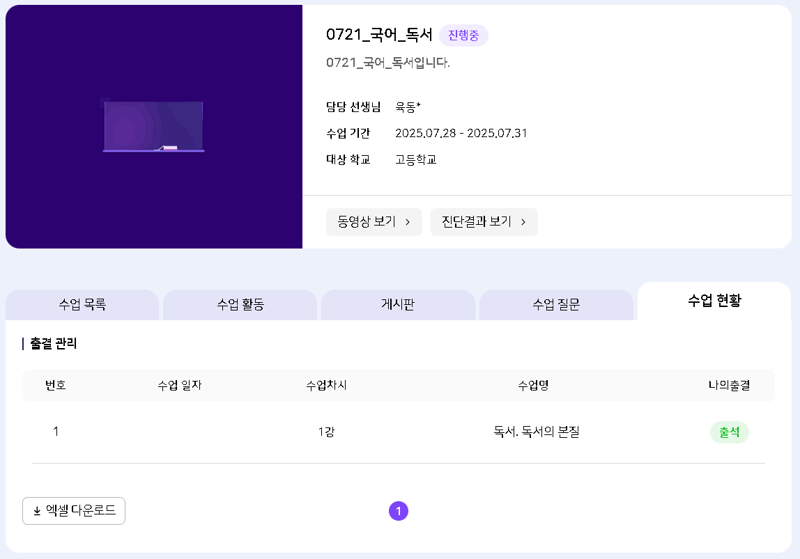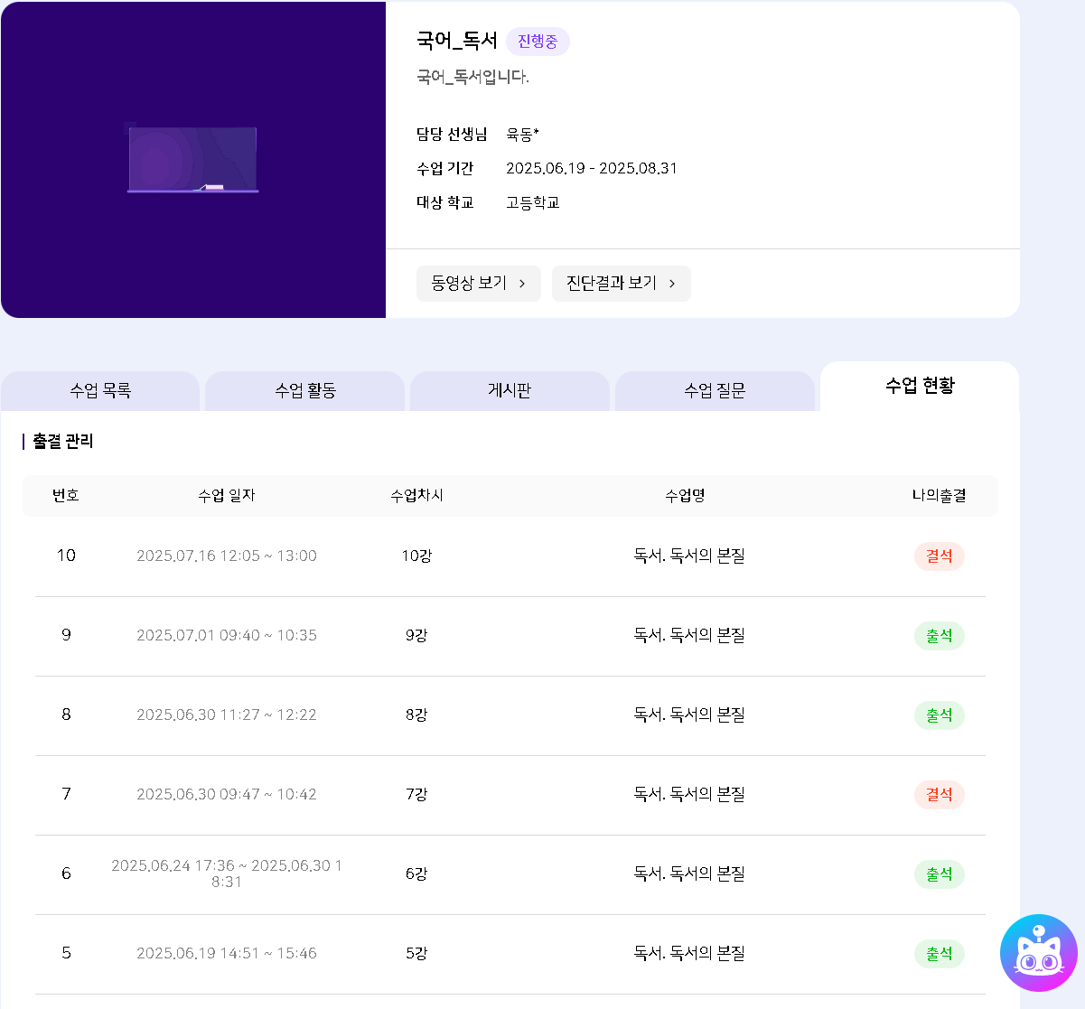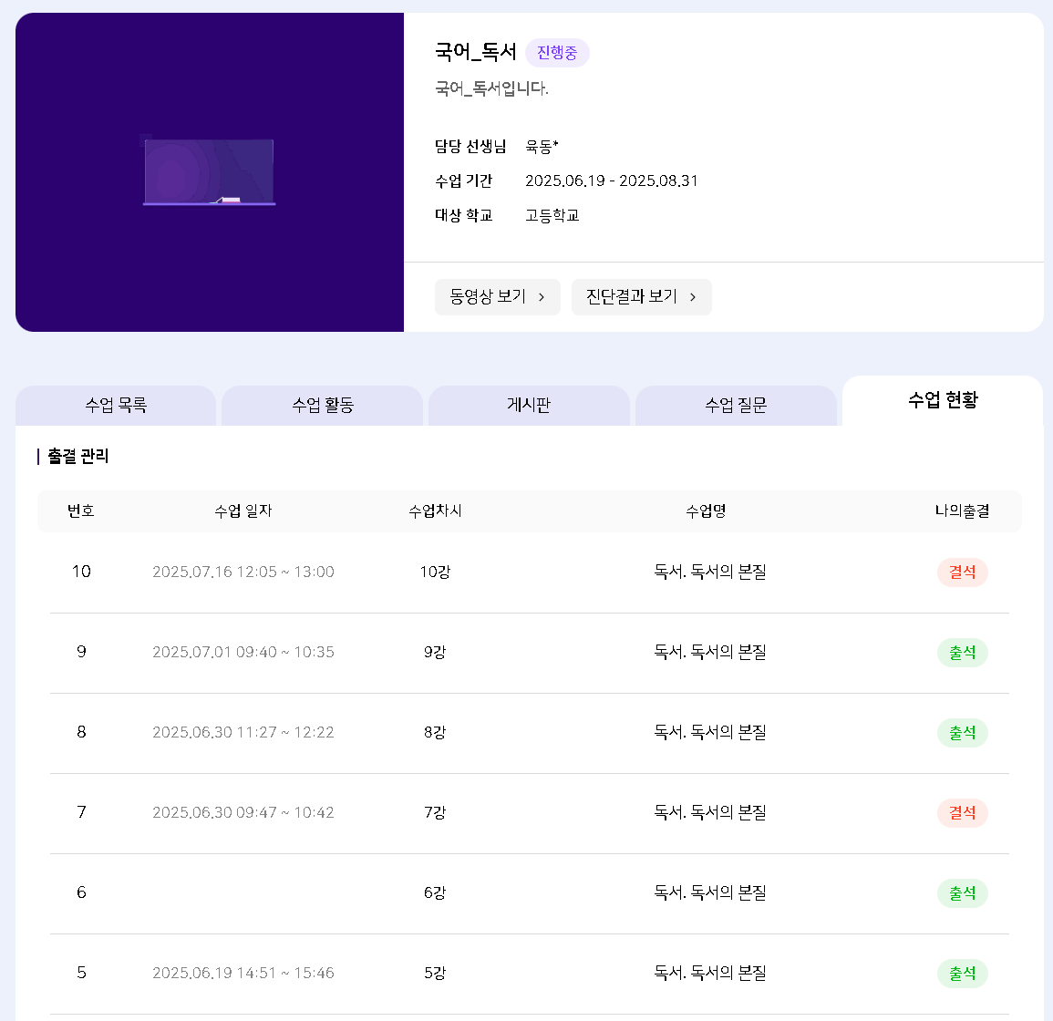 | Steps To Reproduce | 학생 : 나의 학교 > 나의 수업 > 우리학교 필터 > "국어_독서" 과목 등 클릭 > 수업 현황 응시 | ||||