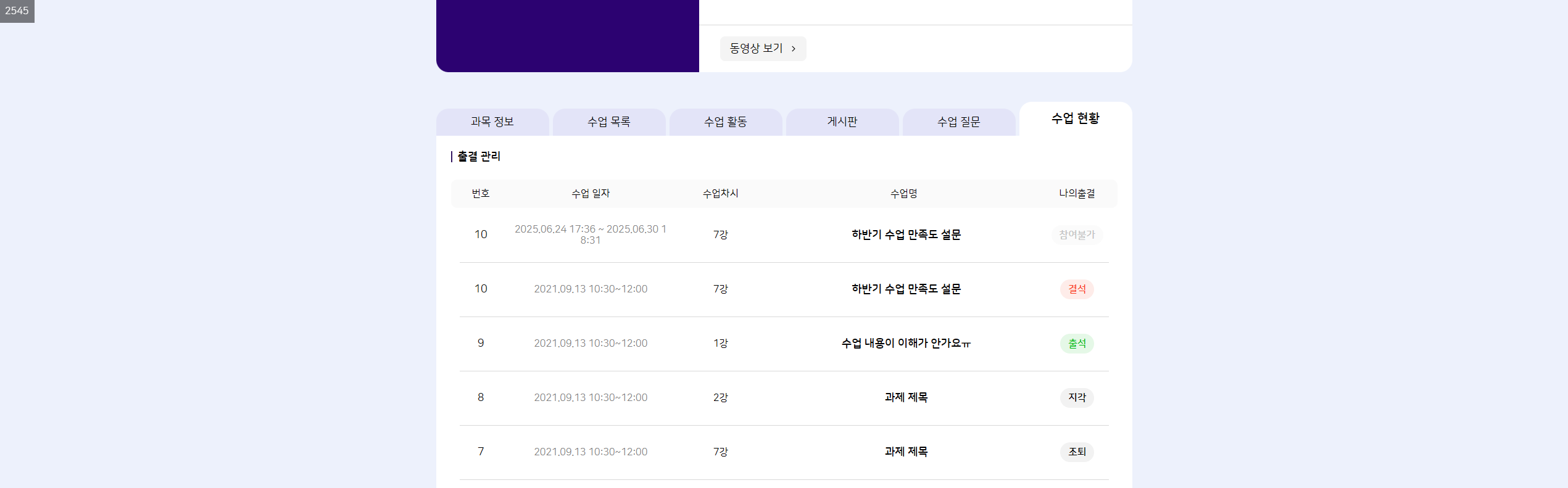 수업일자가 줄바꿈되어 노출되는 것을 퍼블 이슈로 말씀주신 걸까요? 확인 부탁드립니다. 추가로, 전달주신 이미지에 출결관리 번호가 10이 중복노출되네요. 확인 부탁드립니다. |