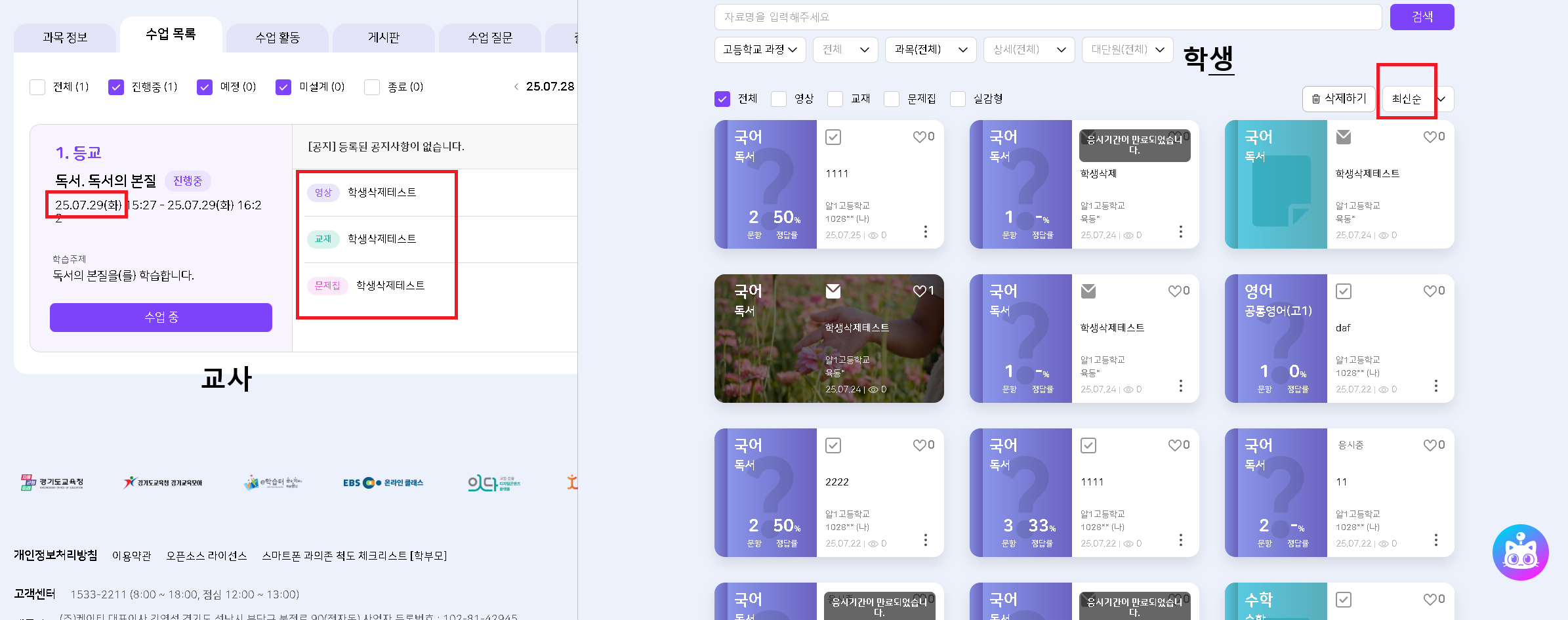 | Description | 교사가 수업에 첨부한 콘텐츠 학생에게 배포되지 않는 현상 발생 온라인 학교/ 우리 학교 과목 모두 학생에게 배포되지 않고있습니다. | ||||