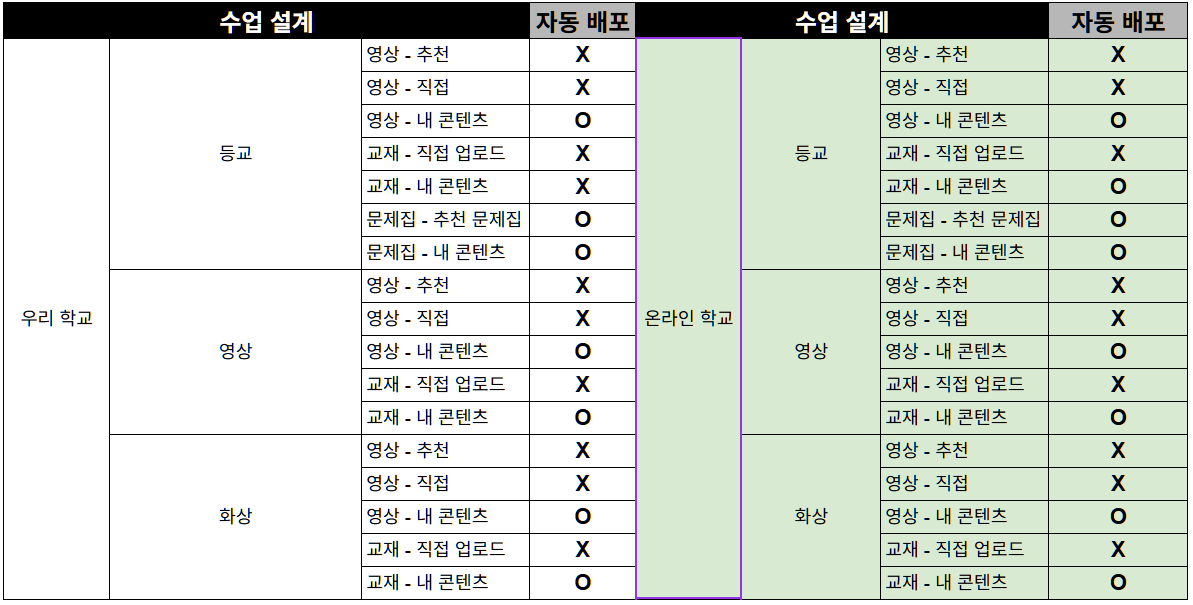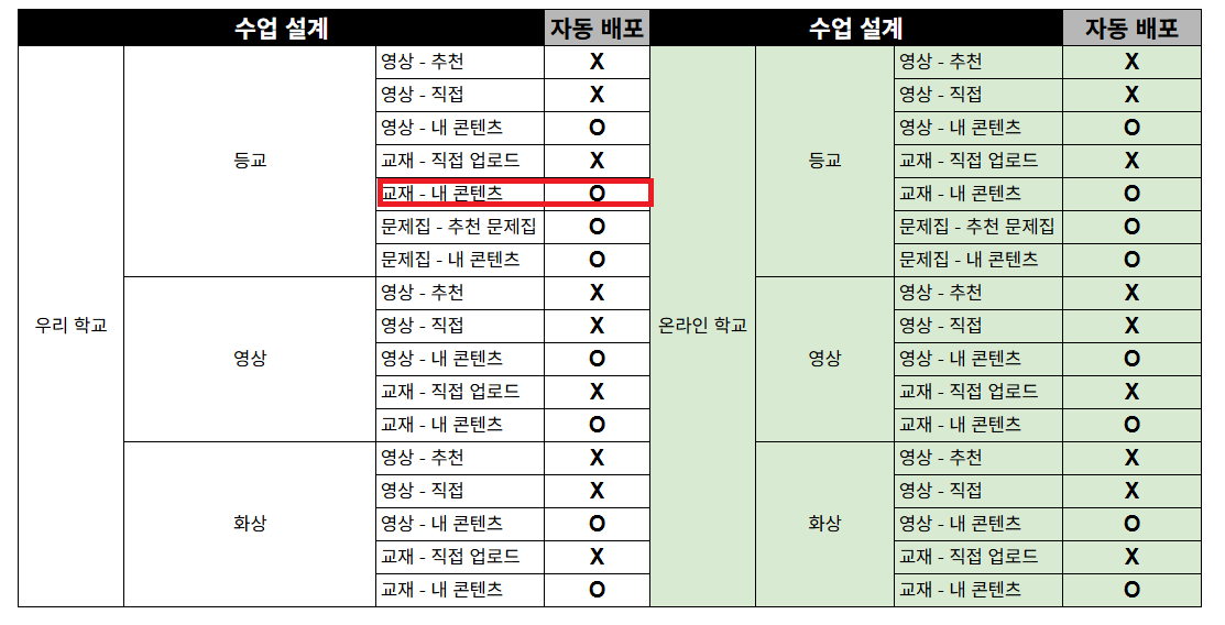 위의 표 수정해서 다시 올려드립니다 수정 전 : 등교 교재 - 내콘텐츠 X 수정 후 : 등교 교재 - 내 콘텐츠 O O가 맞습니다 |