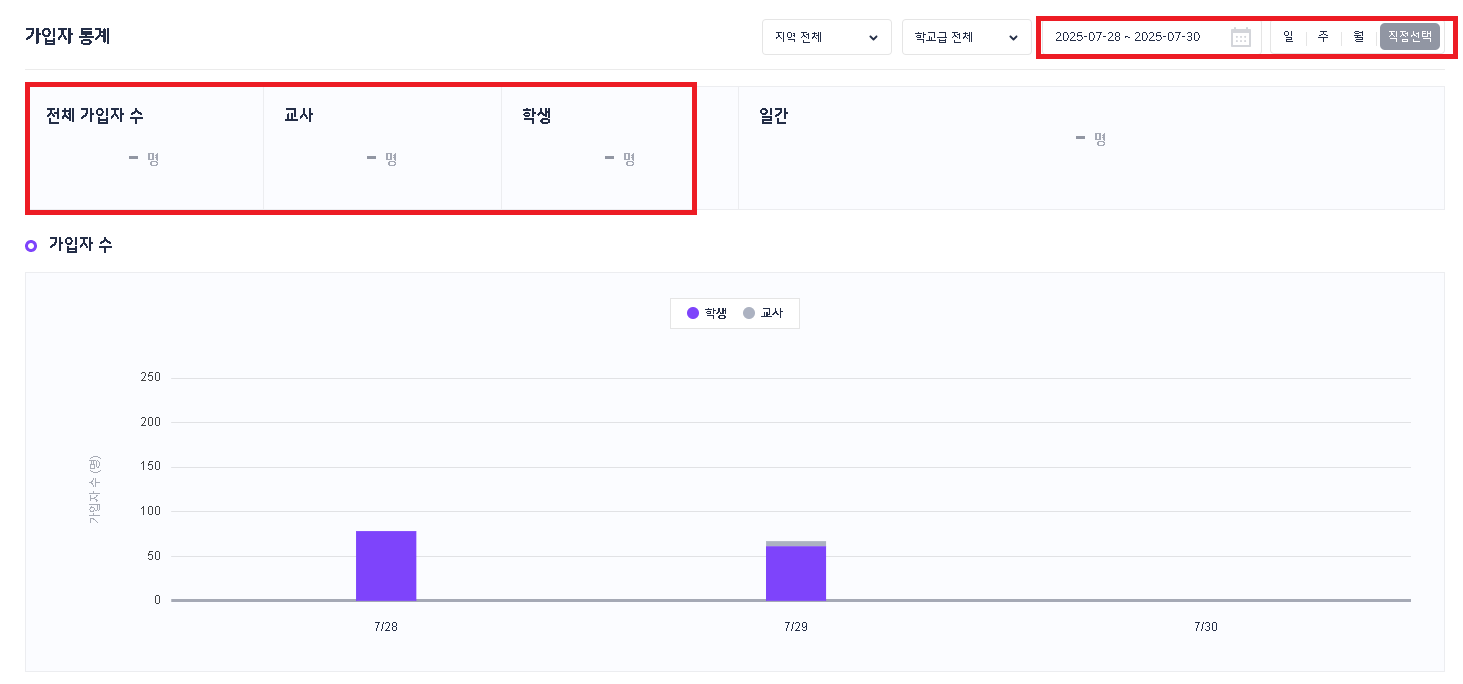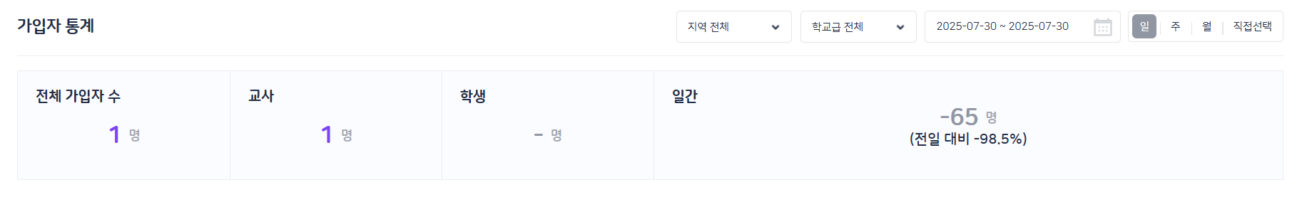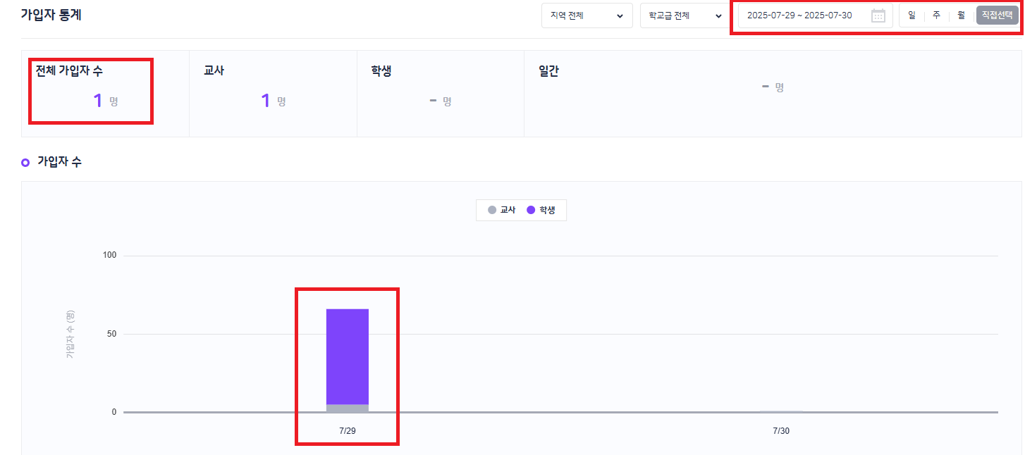 플랫폼 BO 가입자 통계 - 직접선택 시, 전체 가입자 수와 가입자 수가 상이한 현상 가입자 수 확인 시, 7/29 : 교사5 학생 61 7/30 : 교사1 인데 전체 가입자 수가 1명으로 노출됨 |