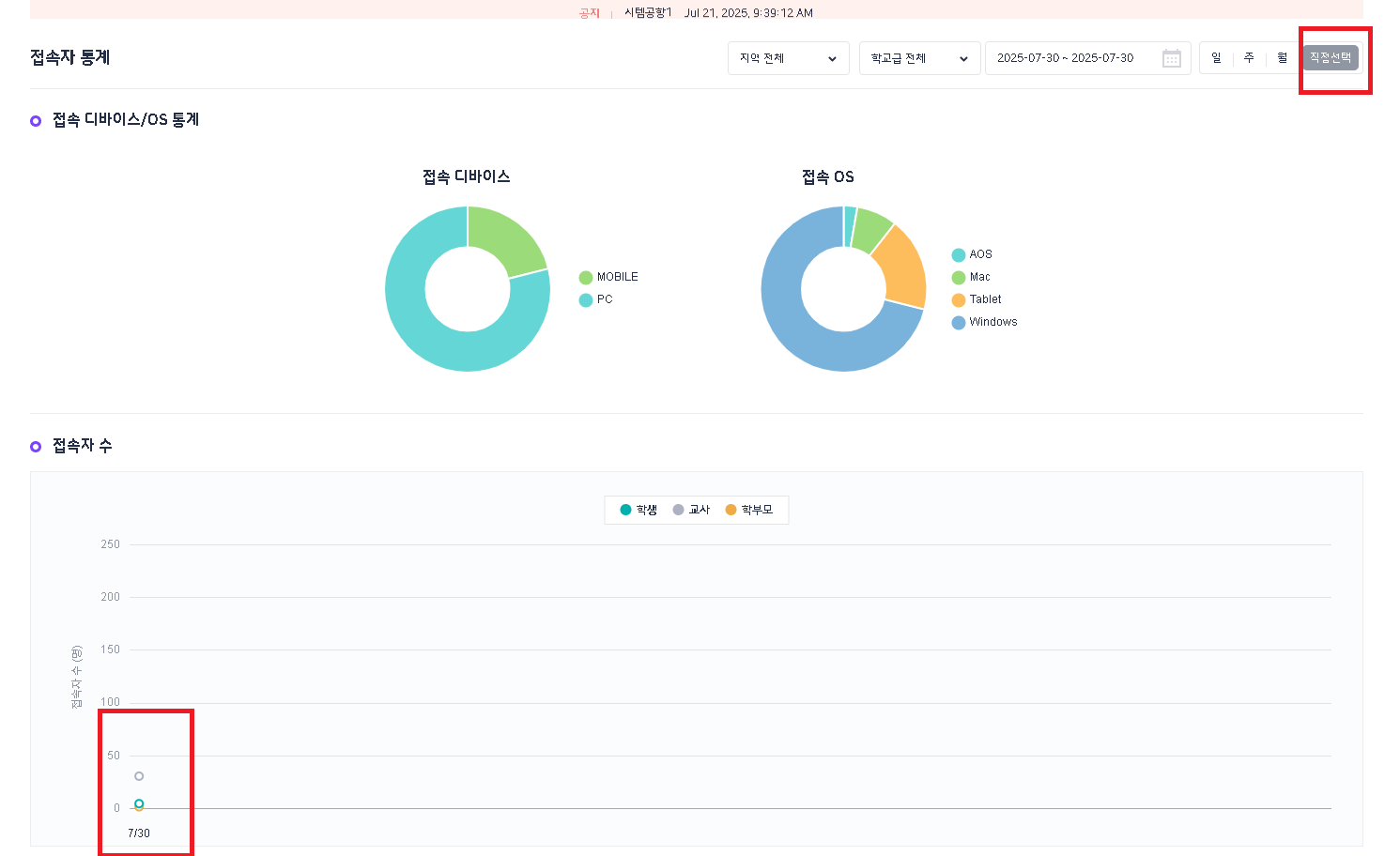 | Description | 플랫폼 BO - 접속자 통계 - 직접 선택 날자 하루만 선택 되었을 시 그래프 가운데 정렬 안되는 현상 직접 선택 필터에서 날자 하루만 선택 안되지만, 일 -> 직접 선택으로 필터 선택 시 하루만 선택되어서 그래프 노출됨. 이때 하루의 그래프가 가운데 정렬 안되는 현상 발생(가입자 통계에서는 가운데 정렬 되어있음) | ||||