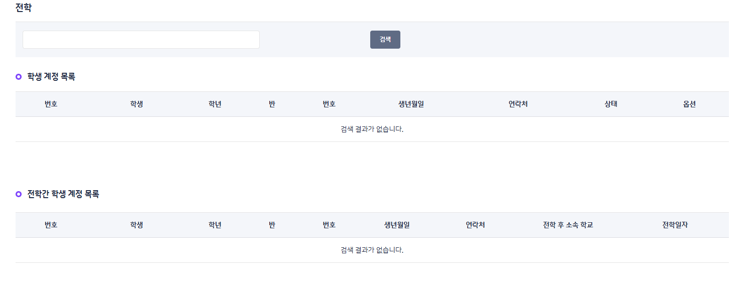 | Steps To Reproduce | 1. 학교 BO 로그인 - 짱짱초등학교1 2. 전학 보내기 4-1-3 학생(이름 : 3징어) 5-1-1 학생(이름 : 오학년) 3. 전학 간 학생 계정 목록 확인 : "검색 결과가 없습니다." 노출 -> 이슈 | ||||