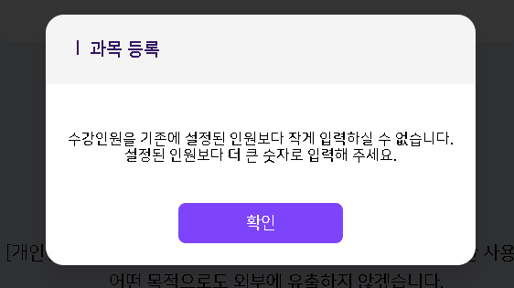 개설과목 수정 후 저장 시, 수강인원 항목에 입력된 값이 현재 승인된 학생 수보다 작은 경우 다음의 alert 노출 부탁드립니다. "수강인원을 기존에 설정된 인원보다 작게 입력하실 수 없습니다. 설정된 인원보다 더 큰 숫자로 입력해 주세요." |