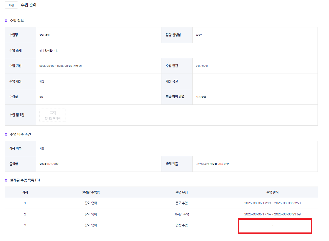 | Description | 학교BO > 수업 정보에 영상 수업의 수업 일시가 노출되지 않는 현상 | ||||
