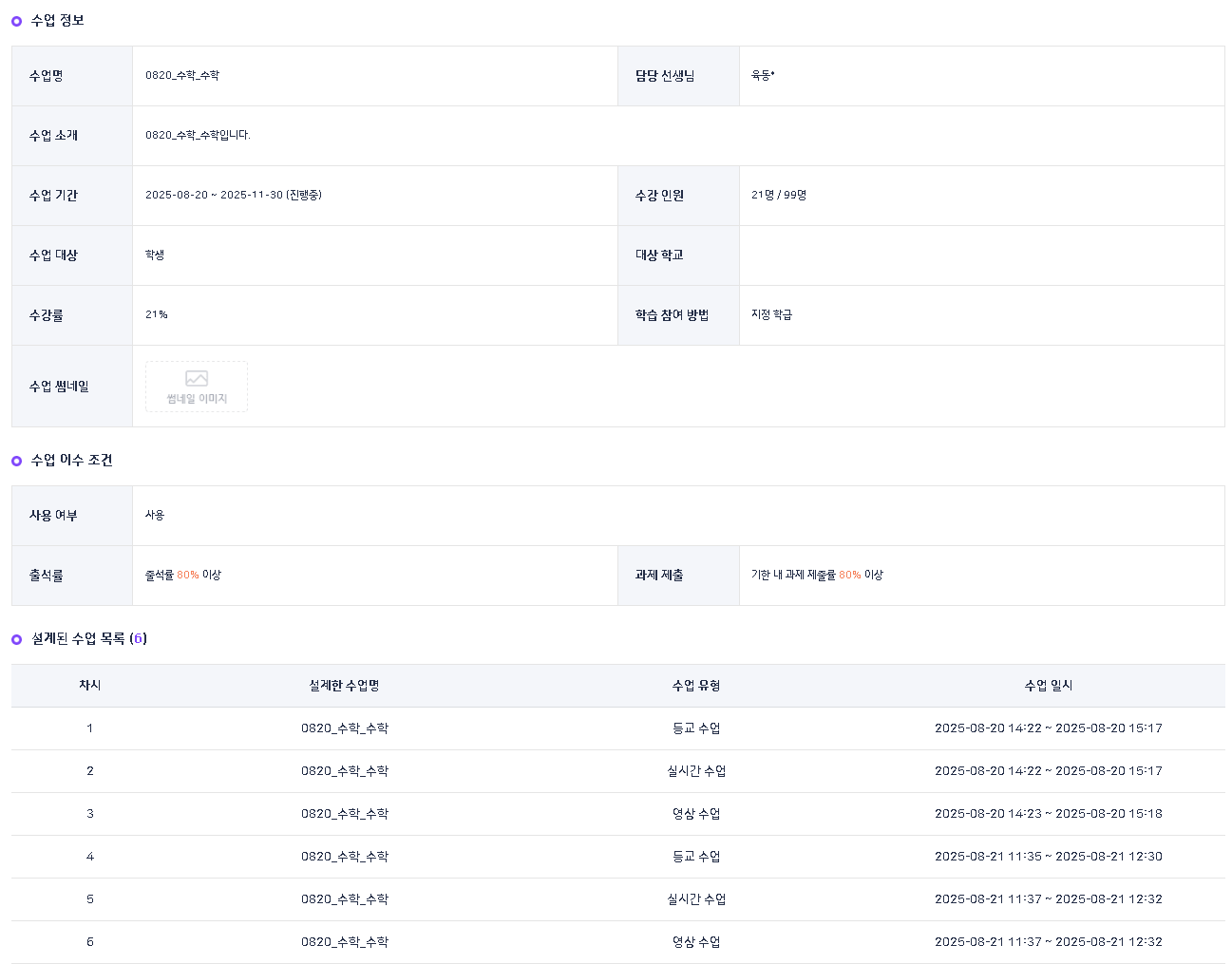 | Summary | 0001439: 학교BO > 수업 정보에 영상 수업의 수업 일시가 노출되지 않는 현상 | ||||