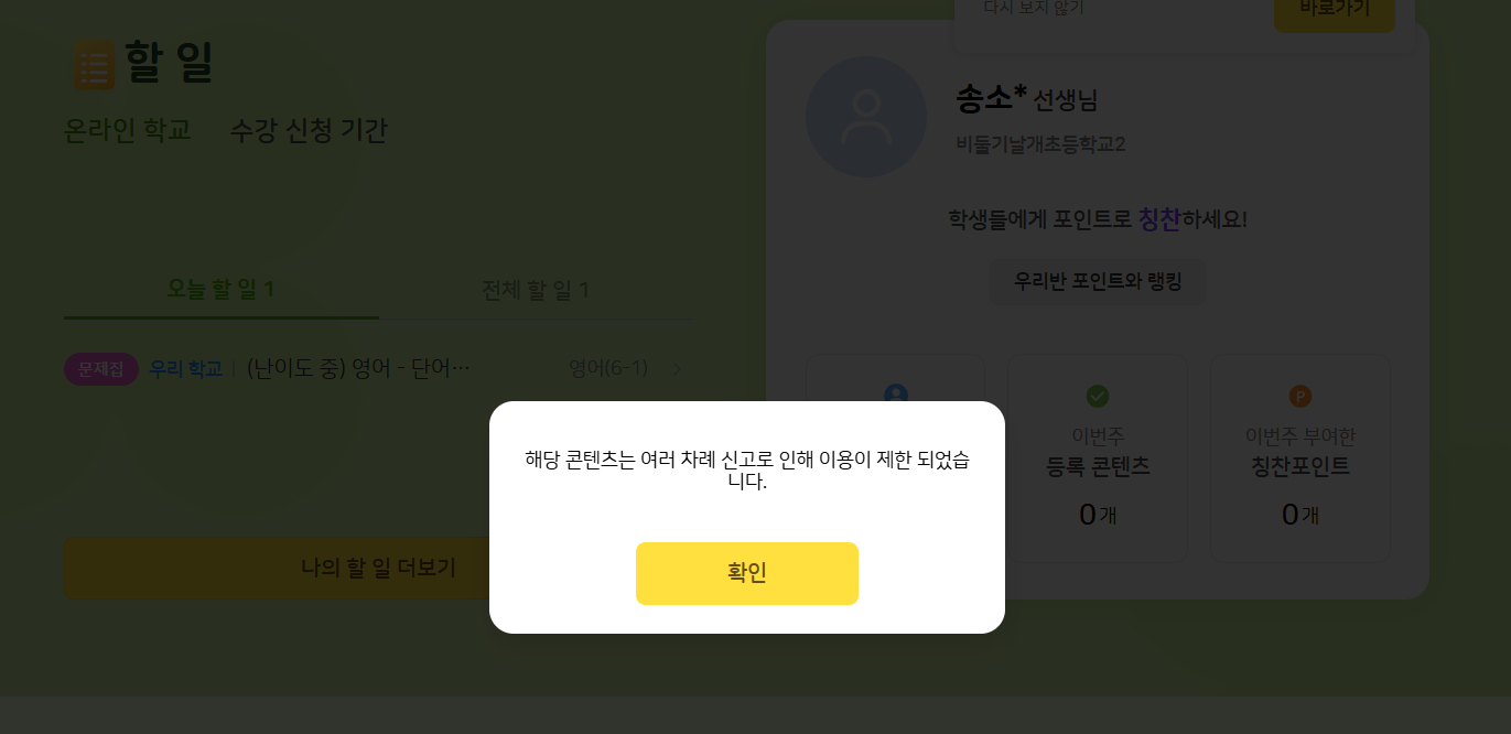 | Description | 수업 설계안 가져오기를 통해 가져온 문제집이 정상 동작하지 않는 현상 이슈1 : 신고된 문제집이 아님에도 불구하고, 메인 > 나의 할일에서 문제집 클릭 시, 신고 콘텐츠 제한 팝업 노출 이슈2 : 수업카드에서 '문제집 보기' 클릭 시, 문항 상세가 아닌 문항 메인화면으로 이동 | ||||