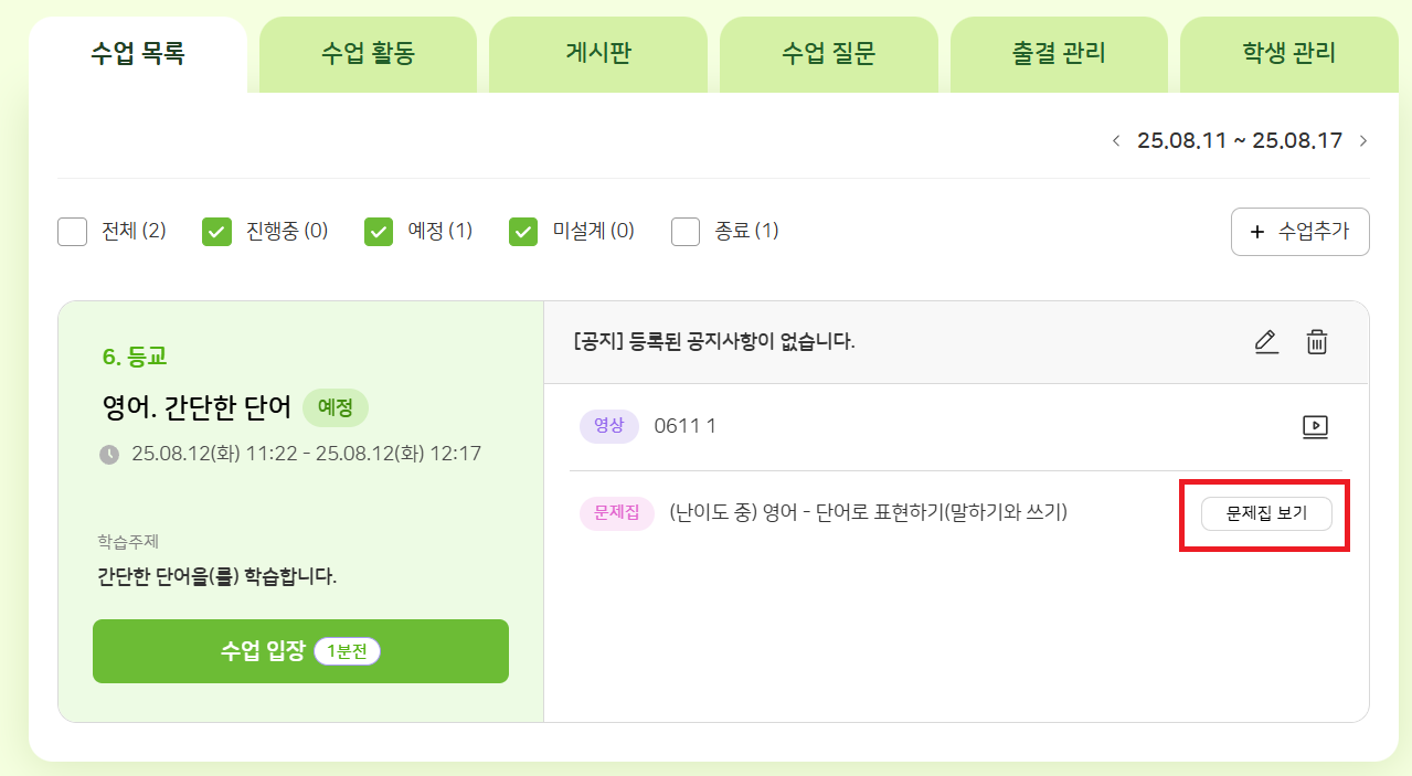 | Steps To Reproduce | 1. sss1004 : 수업 설계안 가져오기 통해서 수업 생성 테스트초등학교01 TC01가 생성한 수업명 : 영어. 간단한 단어 위 수업을 가져와서 수업 생성 2-1. 메인 > 나의할일에서 문제집 클릭 2-2. 수업카드 > 문제집에서 문제집 보기 클릭 | ||||