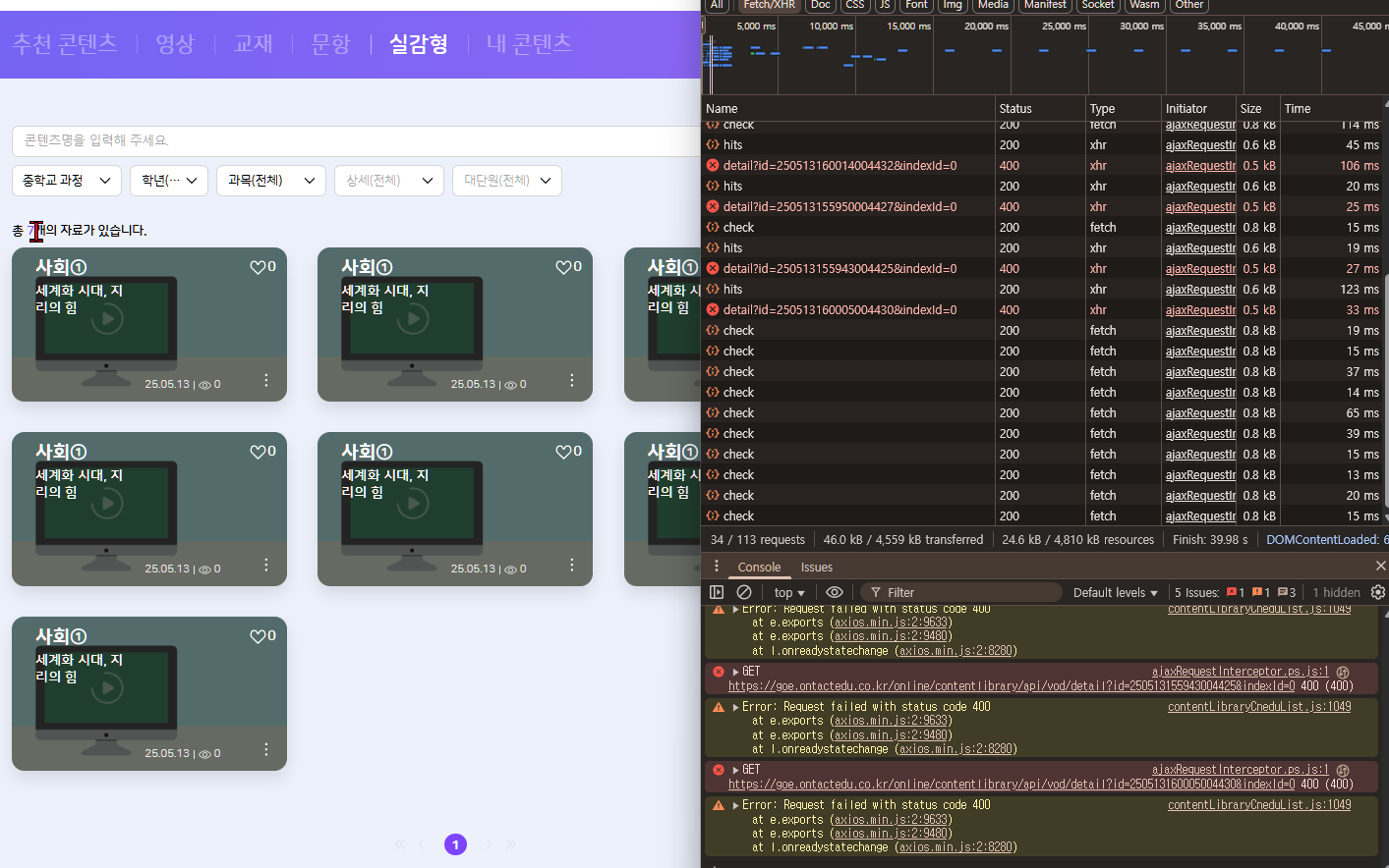 | Description | 학습 콘텐츠 > 실감형 - 중학교 과정에 노출되는 사회① 콘텐츠 7개 클릭 시 400에러 | ||||