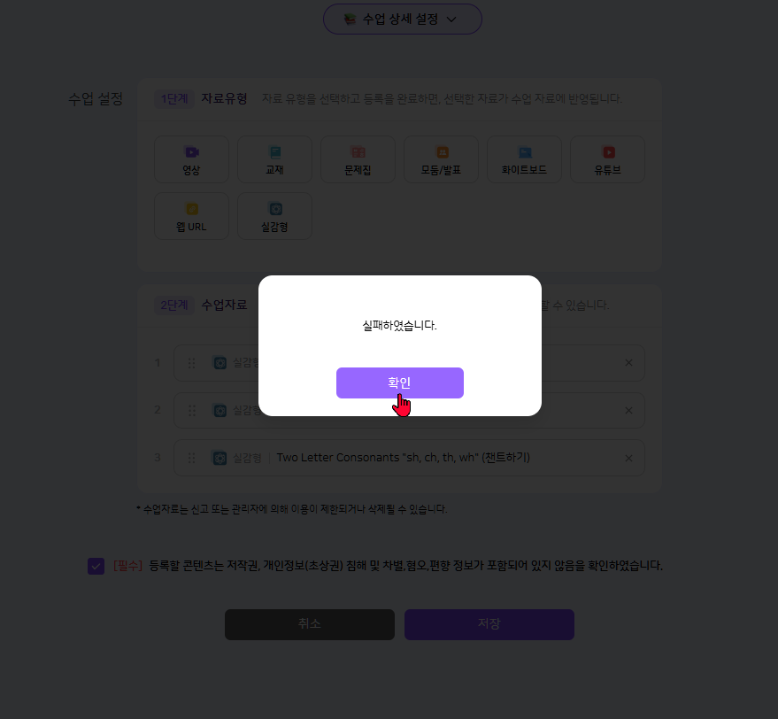 | Description | 수업 설계 > 실감형 > 콘텐츠 조회 > 나의 실감형에서 자료 추가 시 수업 설계 실패 | ||||
