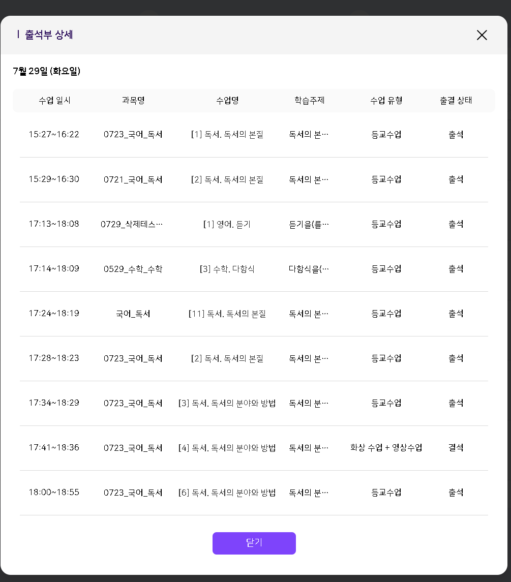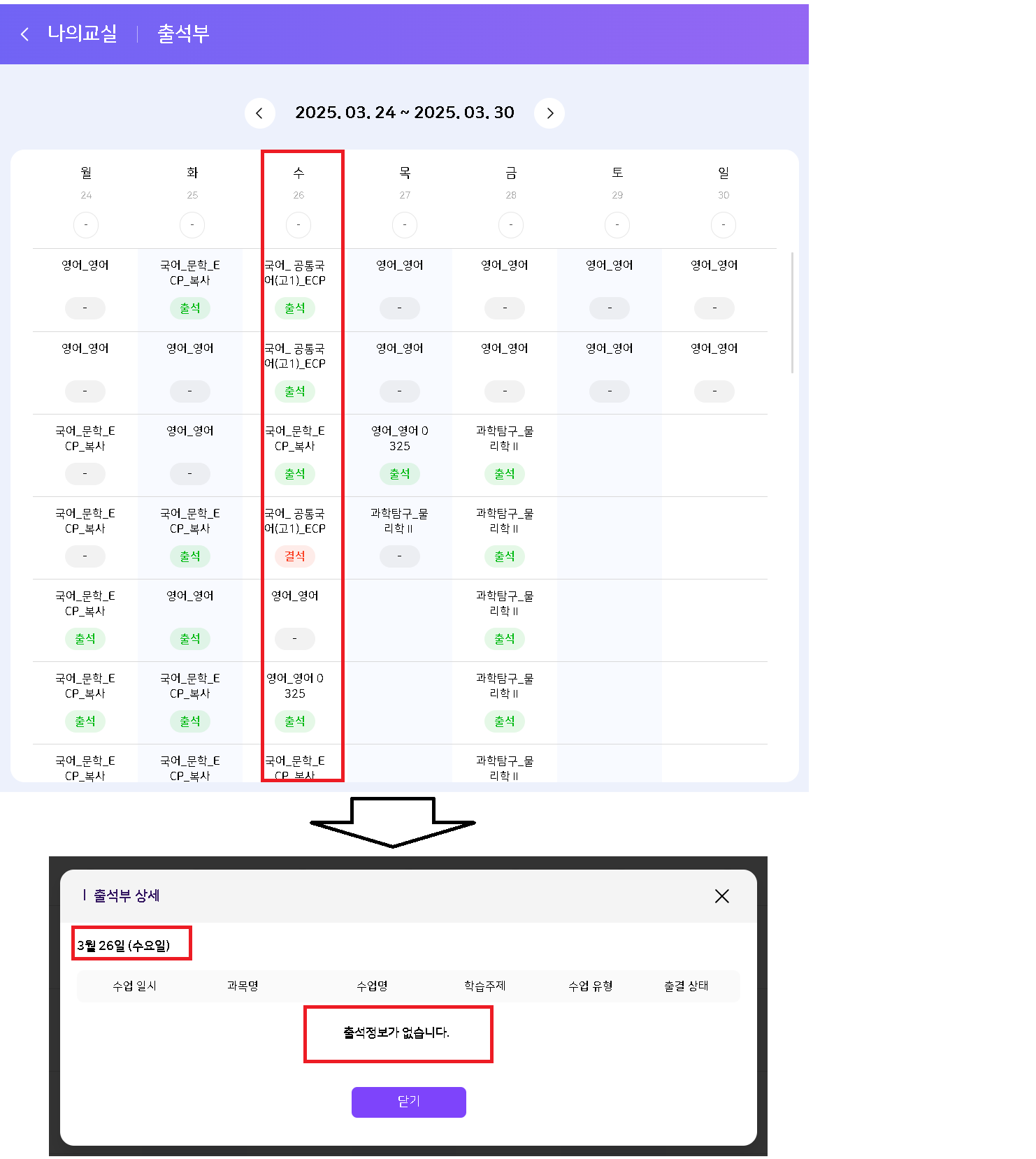 | Description | 학생 - 나의 교실 - 출석부 - 출석부 상세 : 출석 내용 노출 안되는 현상 출석부에는 출석, 결석 표시 되어 있는데 상세 팝업에서는 출석정보 없다고 노출됨 | ||||