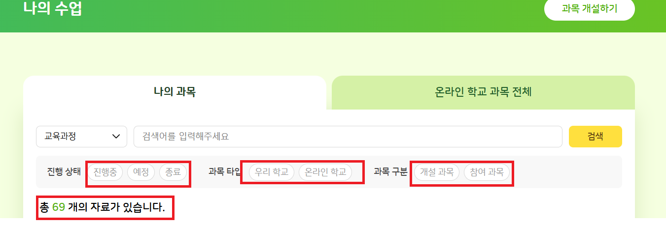 | Description | 나의 과목 탭의 진행 상태/과목 타입/과목 구분 필터가 제대로 작동하지 않는 현상 *진행 상태 : 아무것도 클릭 X (모두 비활성화) 과목 타입 : 아무것도 클릭 X (모두 비활성화) 과목 구분 : 아무것도 클릭 X (모두 비활성화) 인 상태에서는 총 0개의 자료가 있습니다. 라고 노출되어야 하는데 전체 개수가 노출됨 | ||||