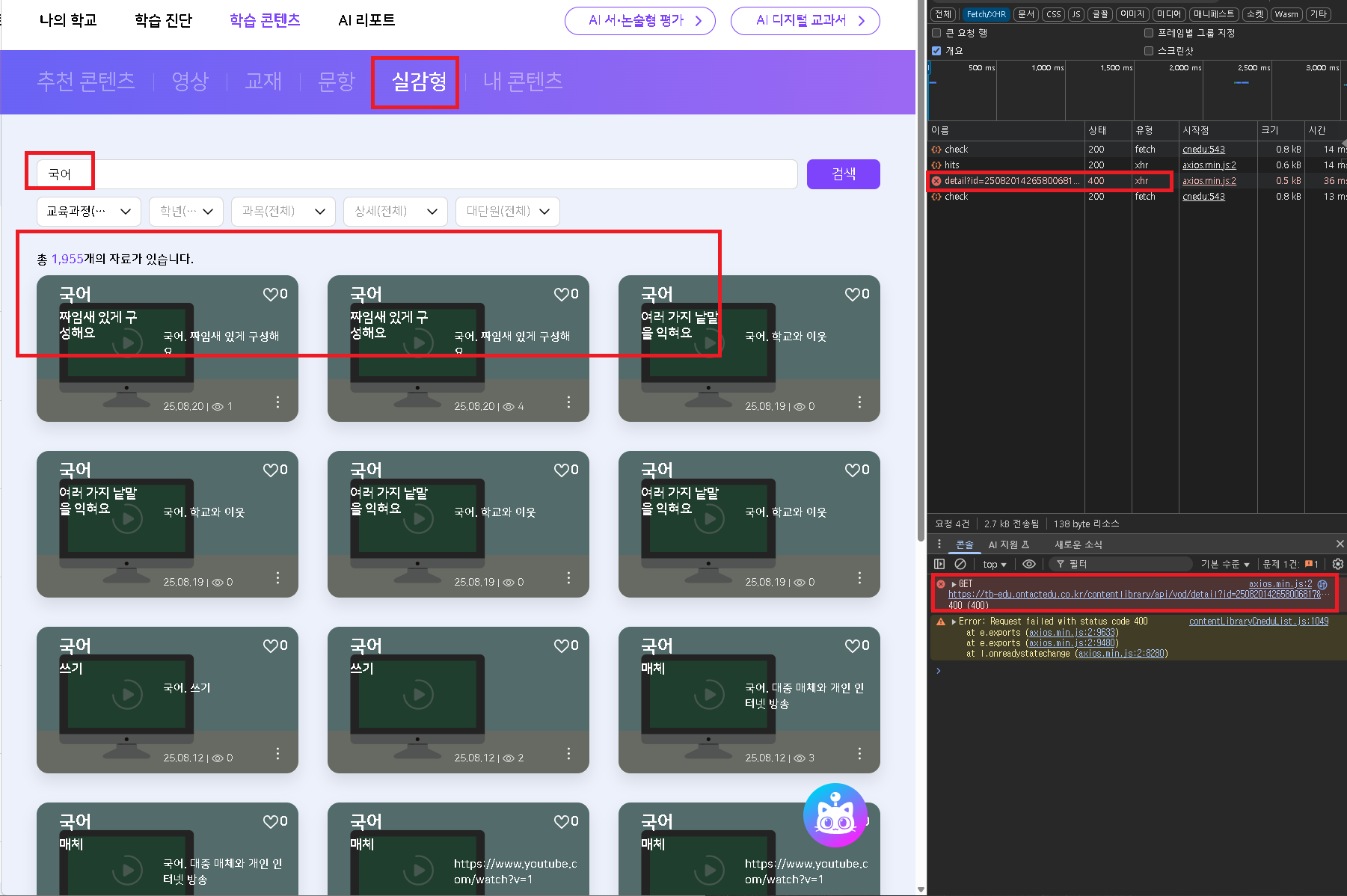 | Description | 실감형 탭에서 "국어" "수학" 등 검색 시 실제론 실감형에 등록 되지 않은 컨텐츠 노출되는 현상 실감형 탭에는 사회 1개, 영어 515개만 등록되어 있는데 "국어"나 "수학" 등 등록 되지 않는 콘텐츠 검색시 콘텐츠가 노출되는 현상. 검색된 콘텐츠 클릭시 400 error 발생. | ||||