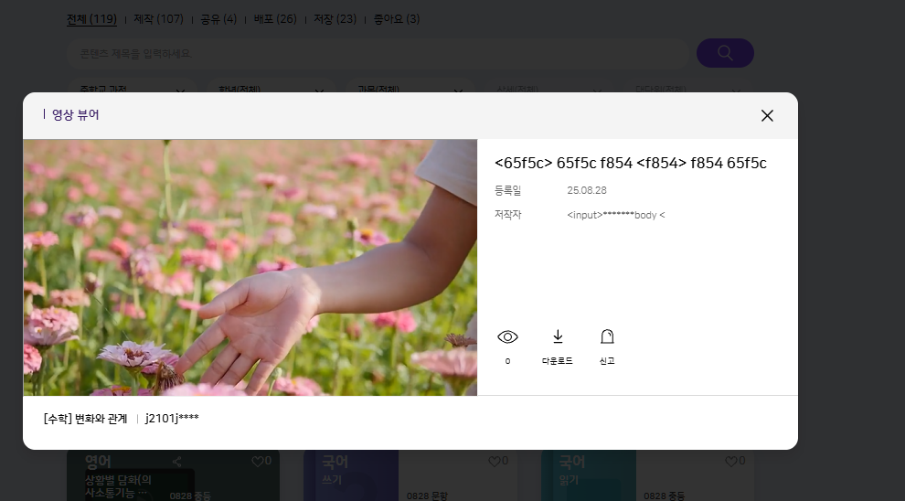 | Steps To Reproduce | 1. 콘텐츠 등록하기 (영상, 교재, 실감형) 2. 제목, 내용, 설명 등 텍스트를 입력할 수 있는 영역에 <input> <body> 를 포함하여 생성 3. 등록된 콘텐츠 확인 | ||||